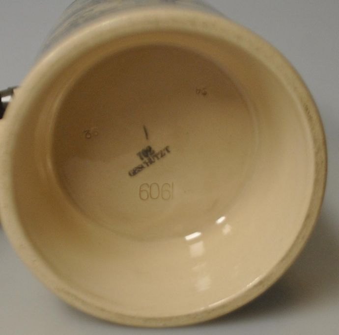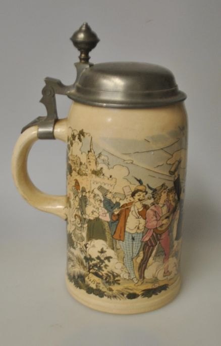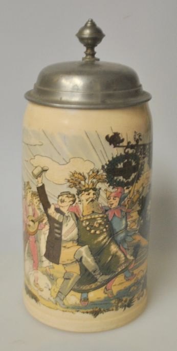 German faience mug with pewter lid 1909. Decoration in transfer technique with procession. H.: 21.5 cm.