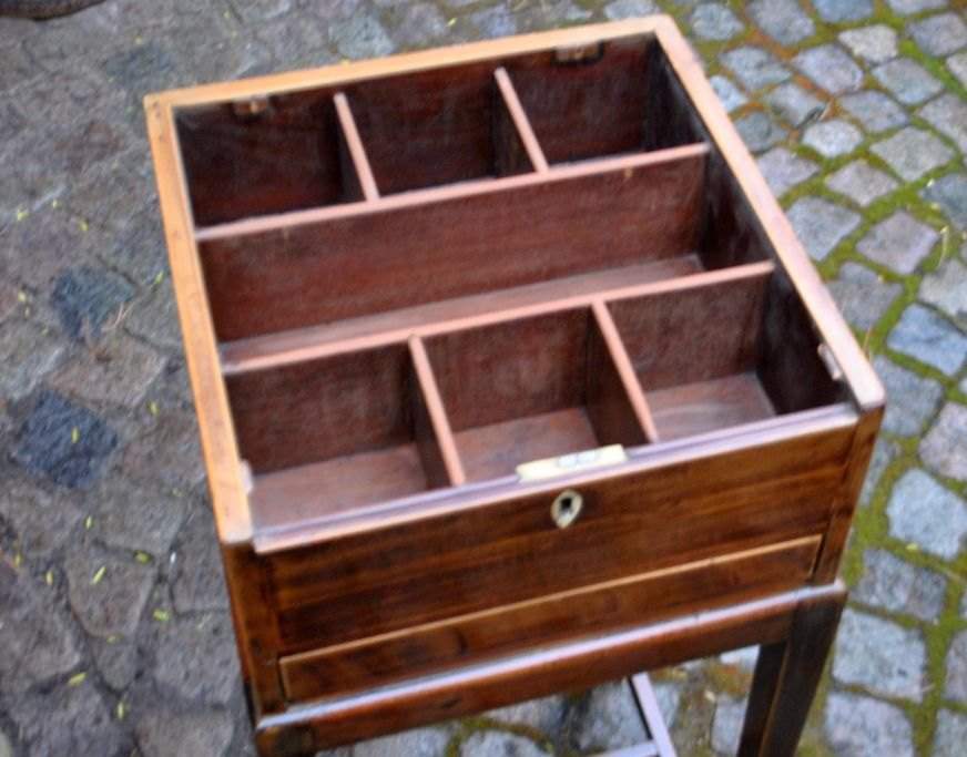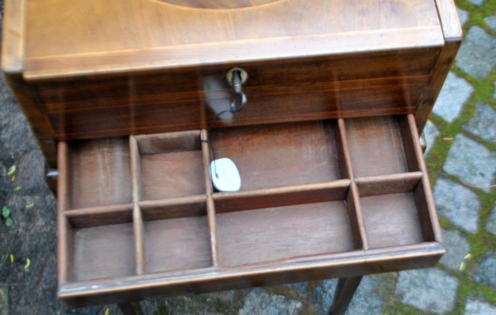 Empire sewing table, 19th century. Denmark. With intarsia. With openable and lockable top, under which there is a smaller compartment. Another drawer with compartment. On tapered legs. H.: 75 cm. W.: 30 cm. D.: 30 cm.Great condition!