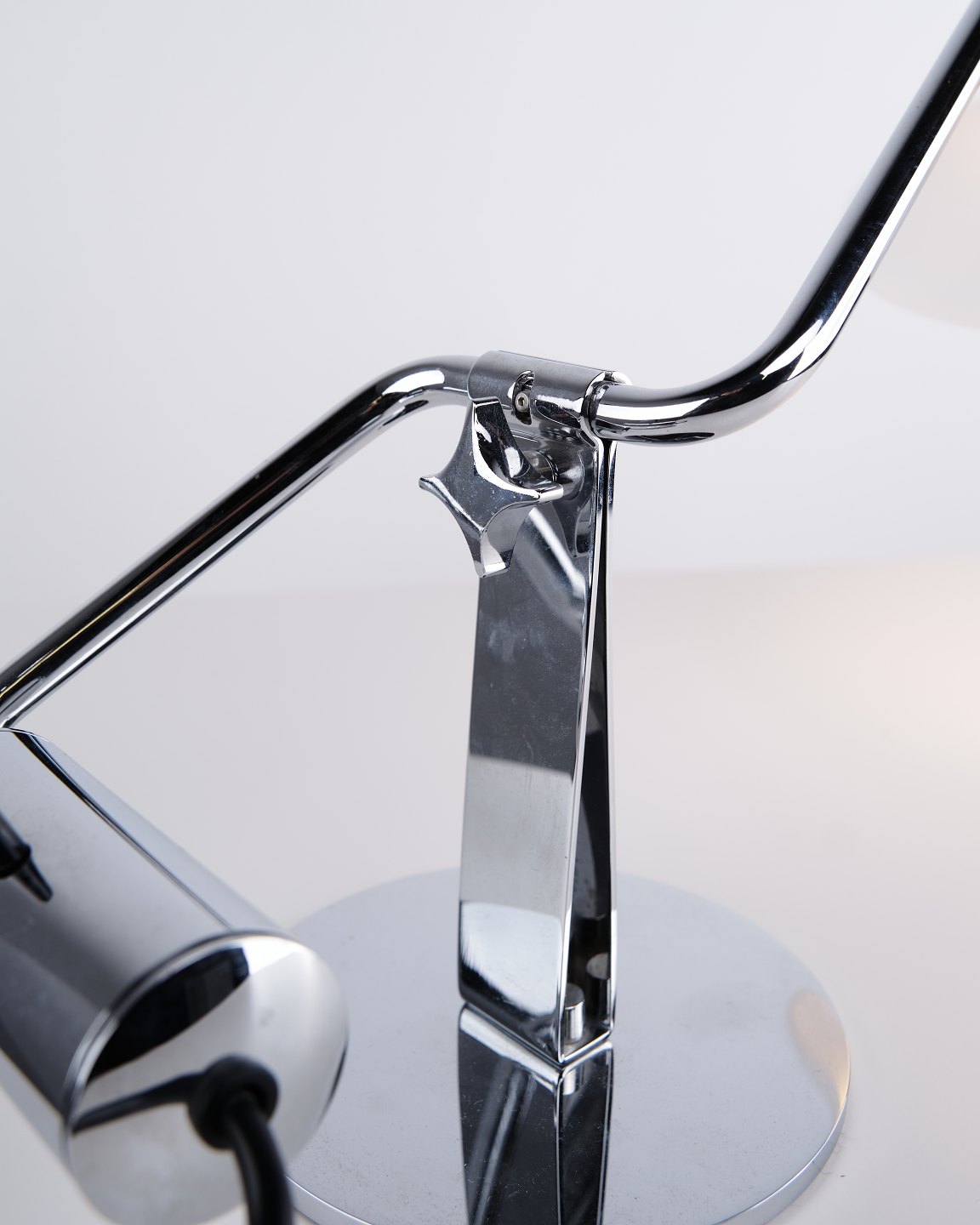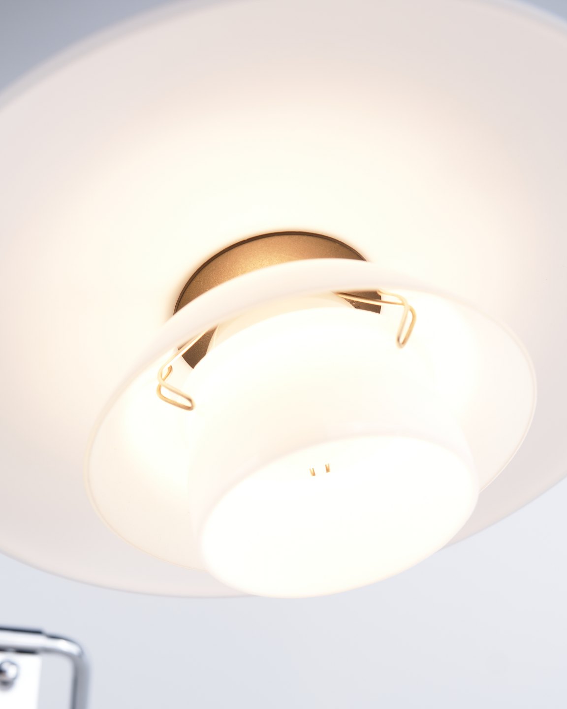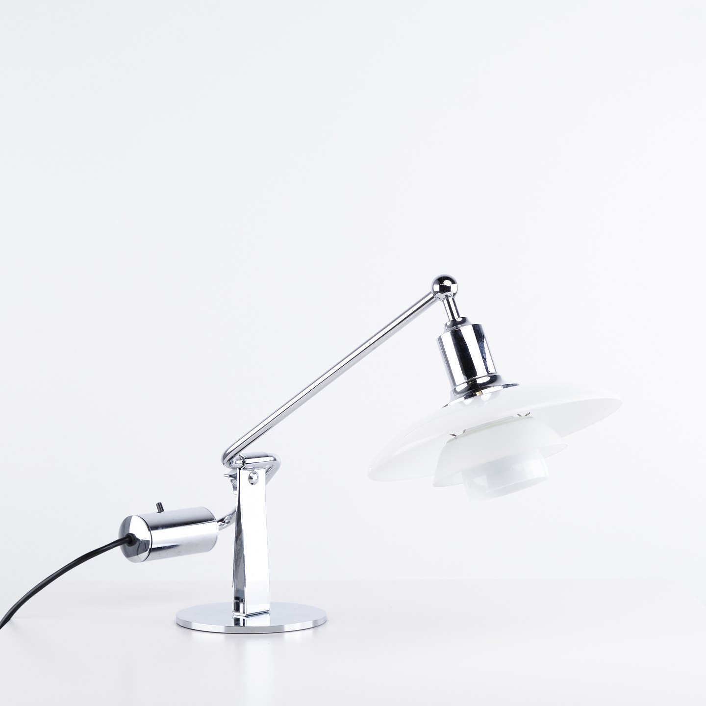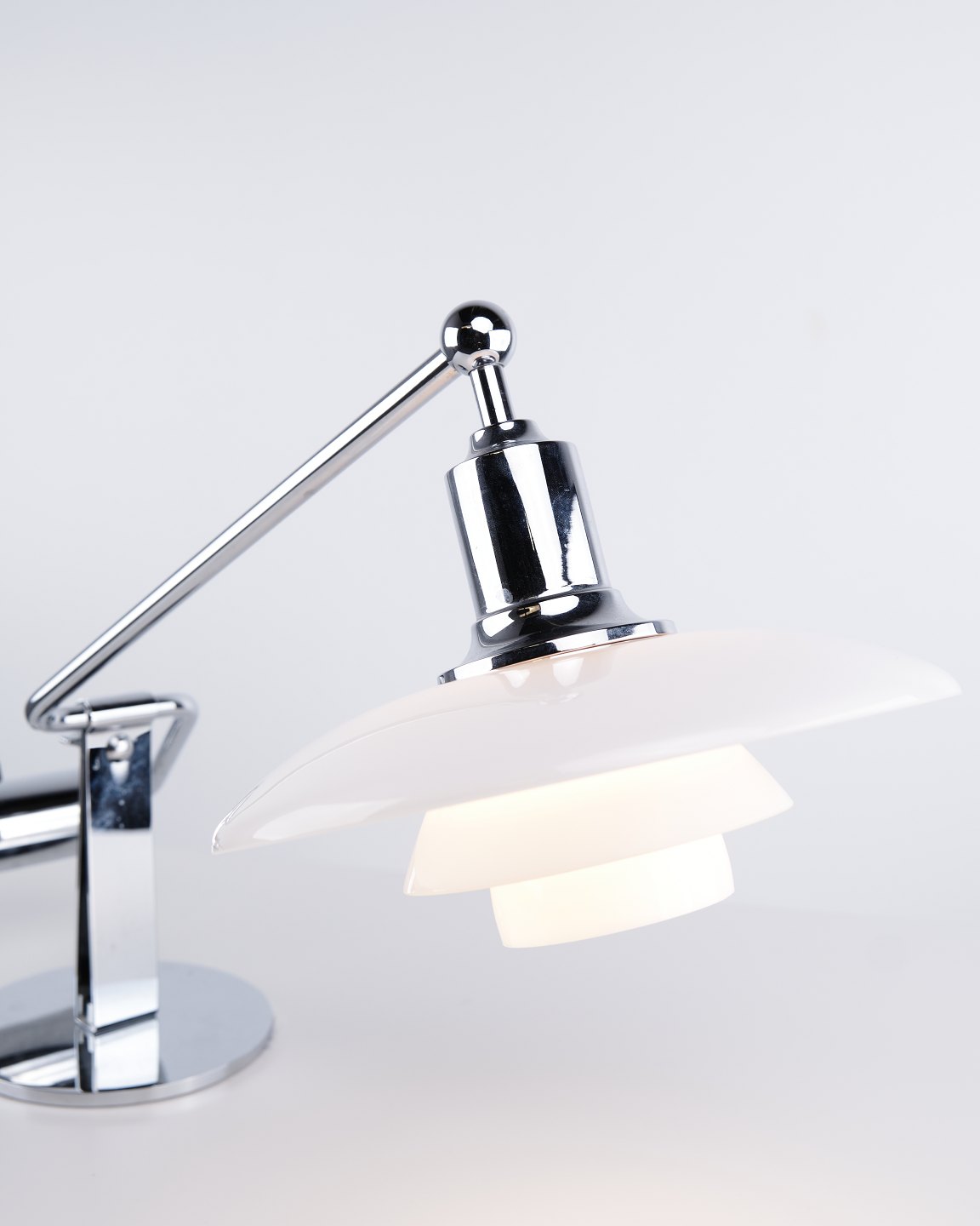 PH 2/1 piano/tilt lamp designed by Poul Henningsen and produced by Louis Poulsen. The lamp is made with shades in white opal glass and an adjustable arm, providing flexible light direction and a soft, glare-free light.