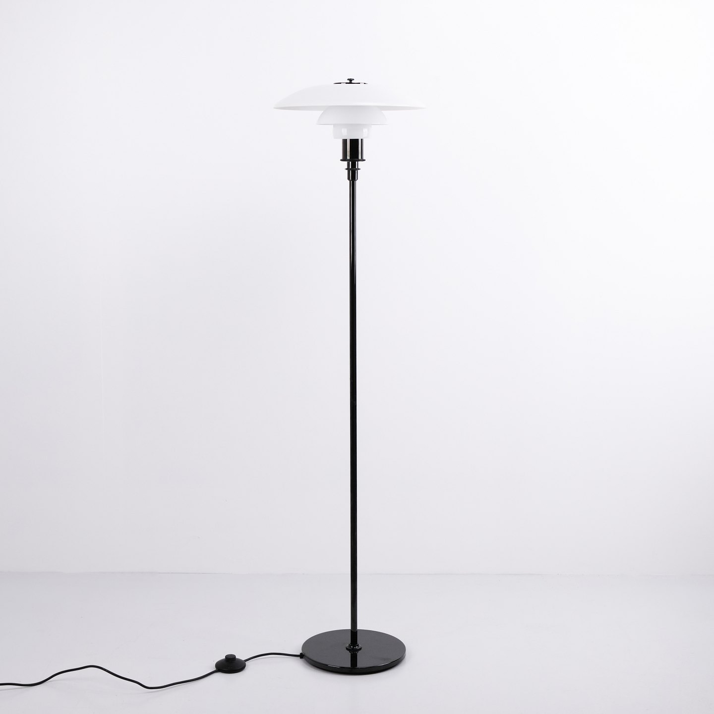 PH 3.5/2.5 floor lamp designed by Poul Henningsen and produced by Louis Poulsen. The lamp is made with a black frame and shades in white opal glass, giving an elegant and balanced expression. The iconic three-shade system ensures a soft, glare-free light and an even light distribution.— Origin: Denmark
