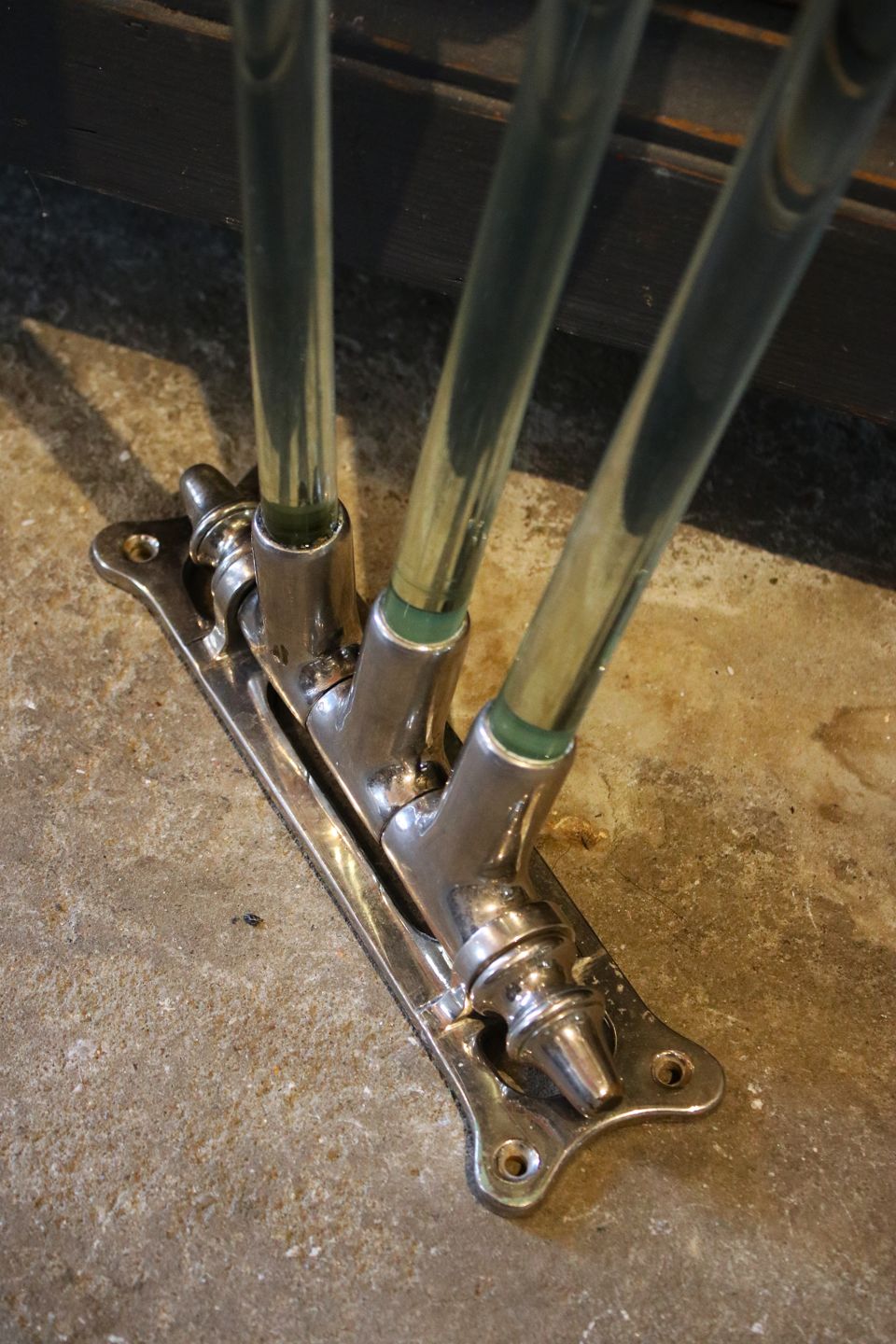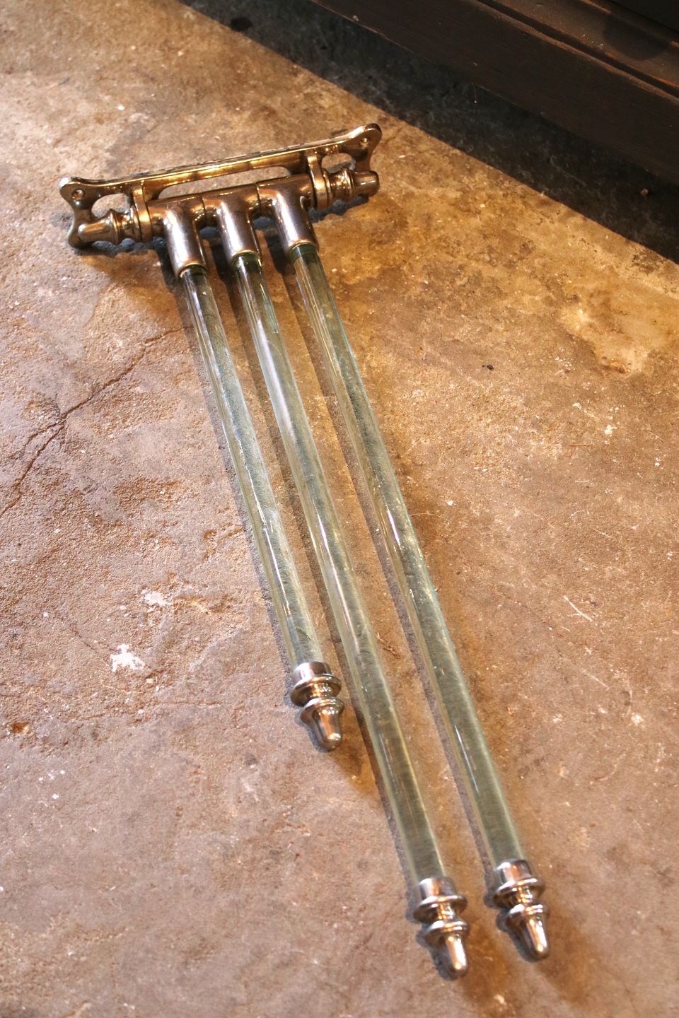 Old French wall-mounted towel holder in chrome and glass rods with a fine patina. H: 20cm. L: 55cm. (one glass rod measures 42cm.) Dealer