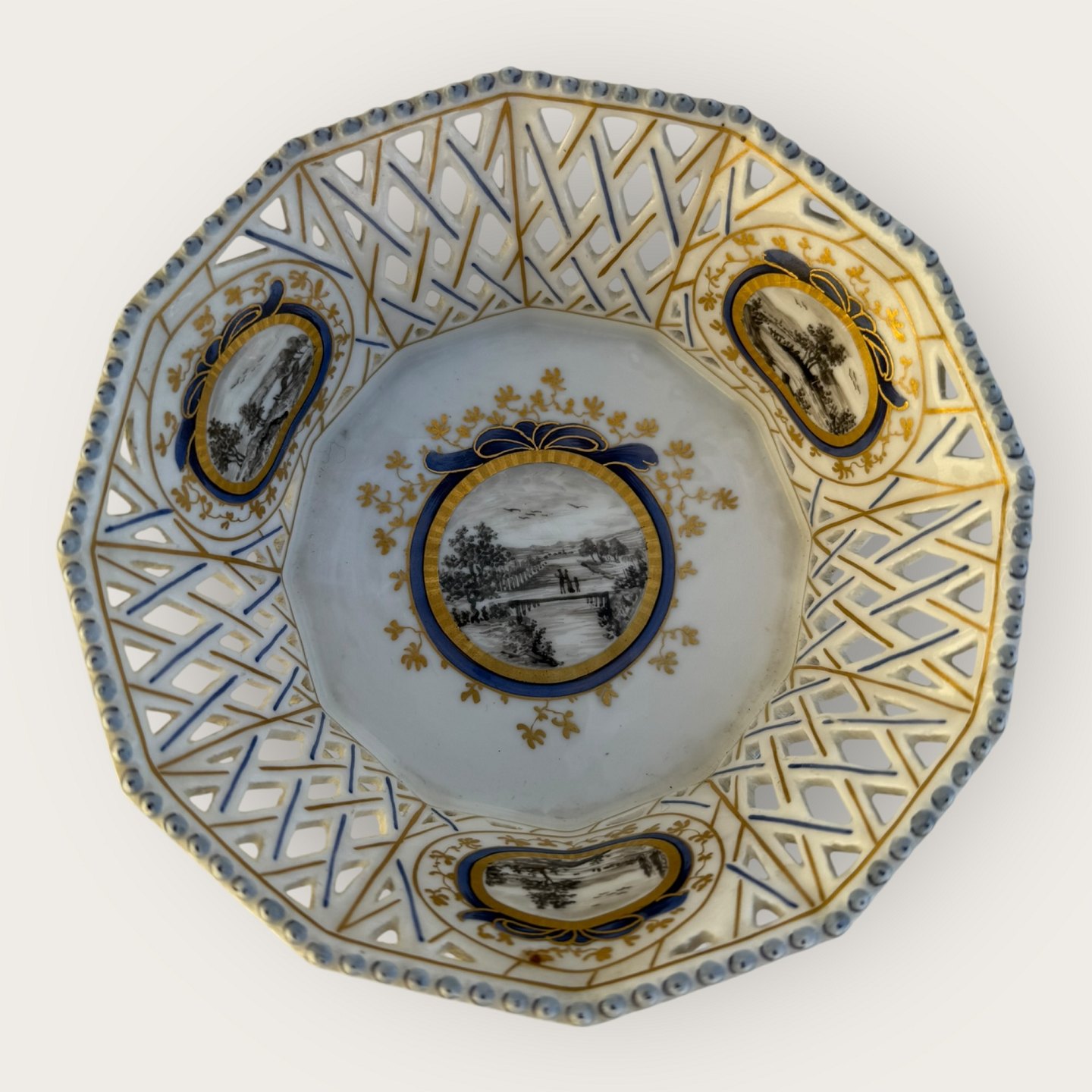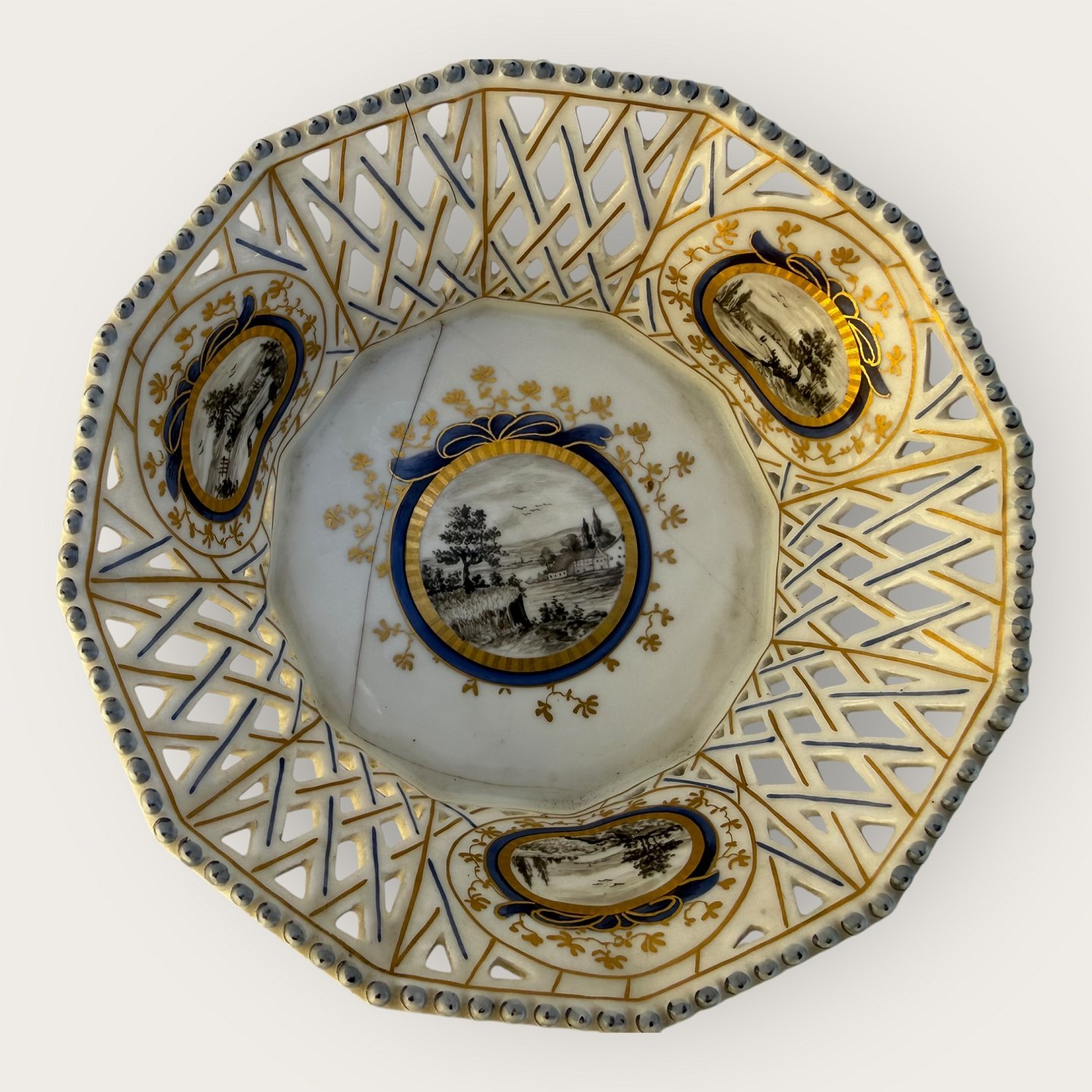 Nymphenburg porcelain, two reticulated bowls (openwork grid pattern on the edge), with hand-painted landscape motifs, one bowl with a crack at the bottom (see photo) otherwise in fine condition, each bowl measures approx. 5x14cm.Stock: 1