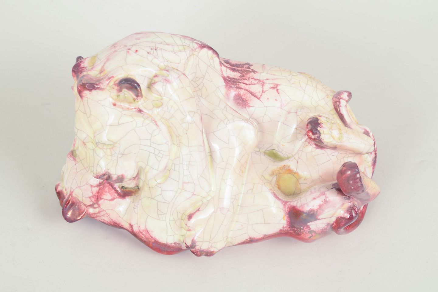 Karl Hansen Reistrup for Kähler, figural group with lion and lioness.Naturalistically modelled figural group in glazed earthenware depicting a playful lion and lioness. Decorated with a rich red and cream crackle glaze with organic transitions.