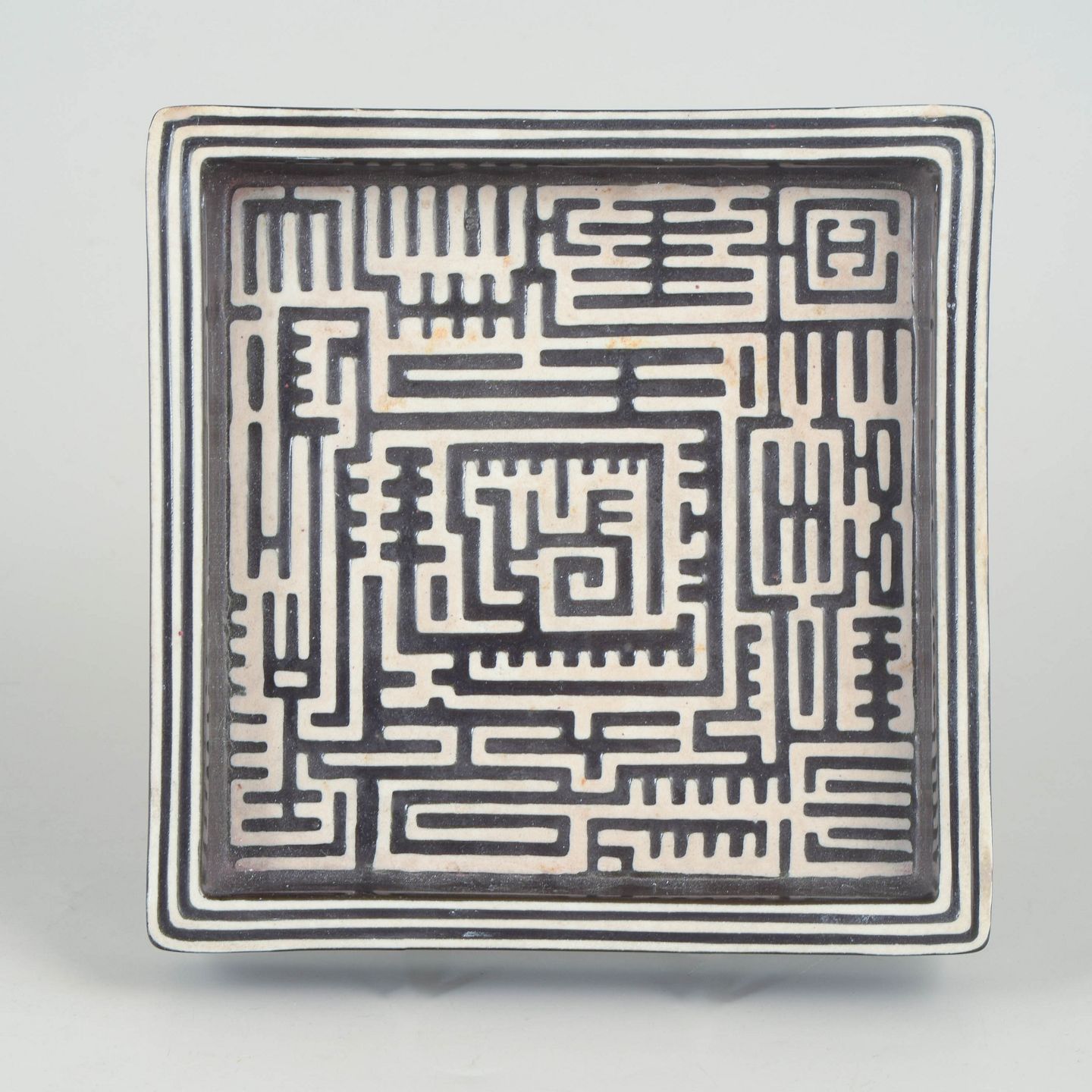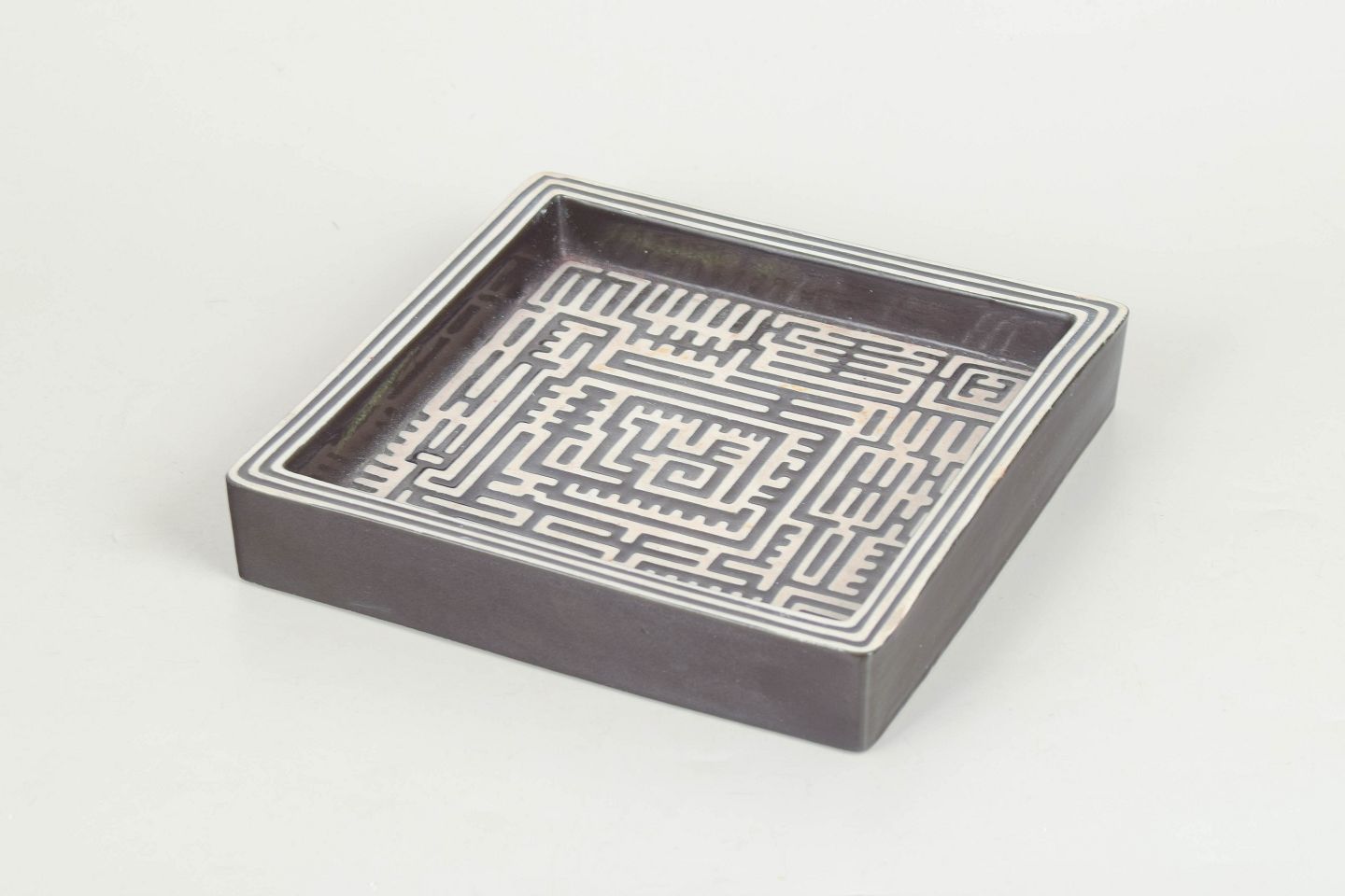 Stig Lindberg for Gustavsberg, Domino dish.Square stoneware dish decorated with the characteristic Domino pattern in black on a light ground, featuring a graphic labyrinth-like ornamentation. Model Domino.