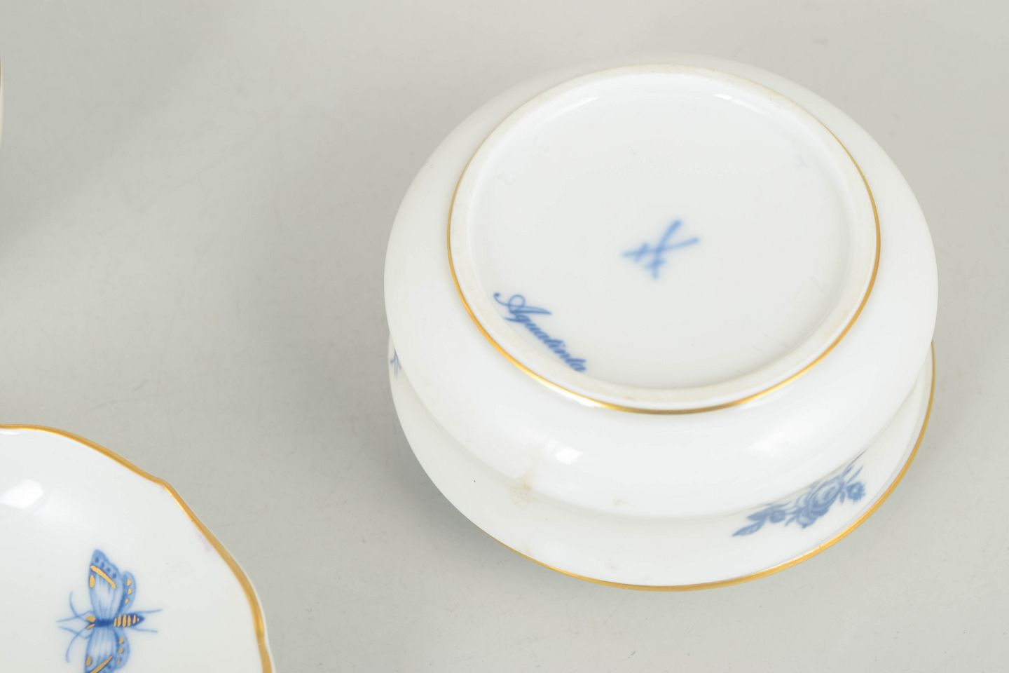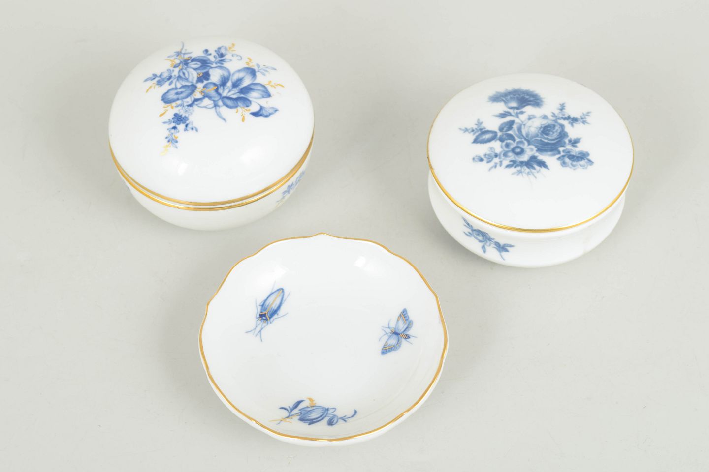 Meissen Aquatinta, set of two lidded jars and one dish.Two lidded jars and a small dish decorated with floral and insect motifs in blue tones with gilt rims. Model Aquatinta. Marked with Meissen crossed swords, first factory quality.