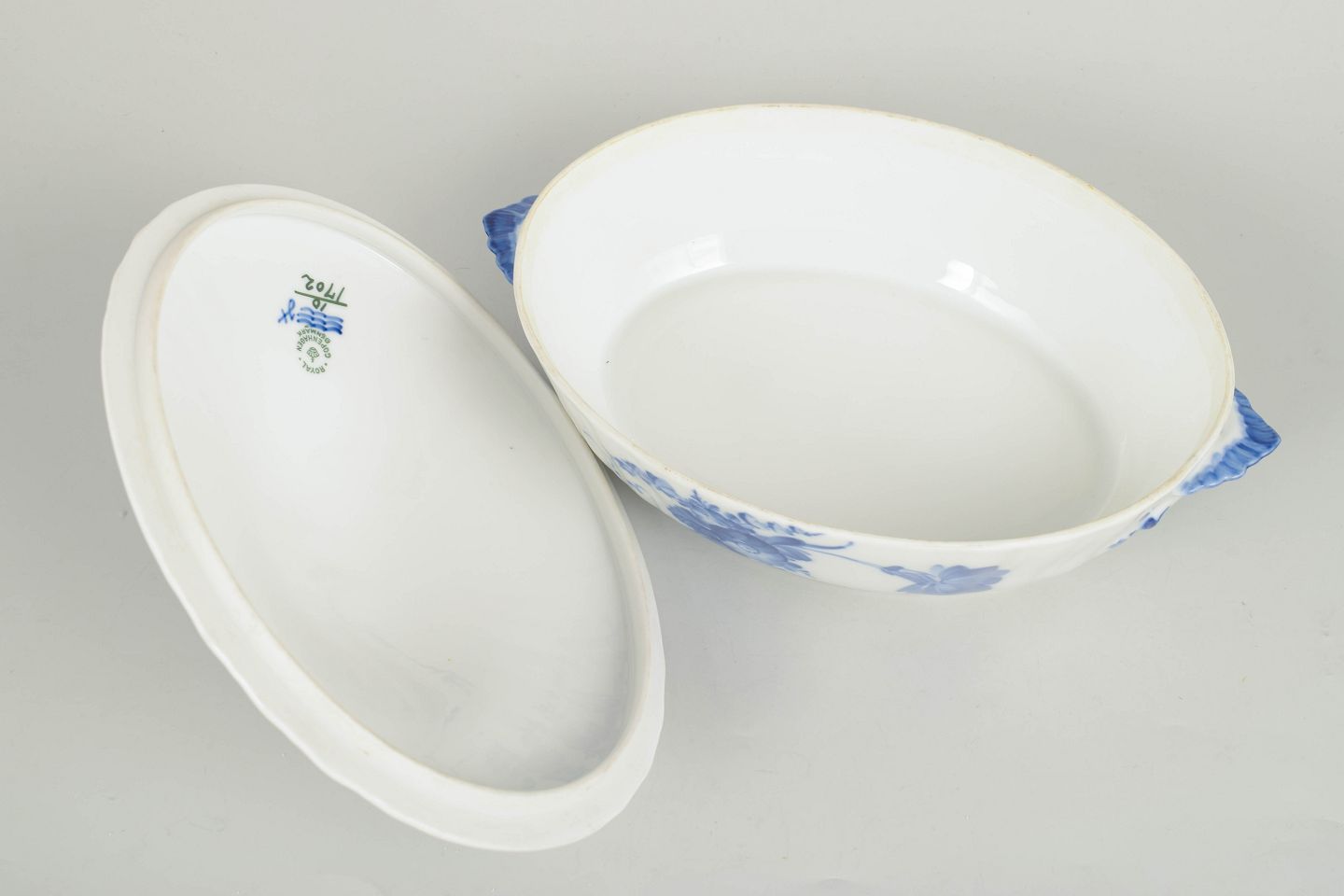 Royal Copenhagen, Blue Flower Curved oval lidded tureen.Oval porcelain tureen with lid and side handles, decorated with hand-painted blue floral motif in relief.