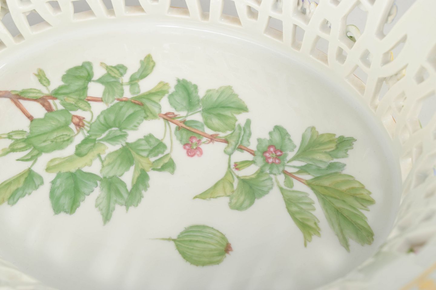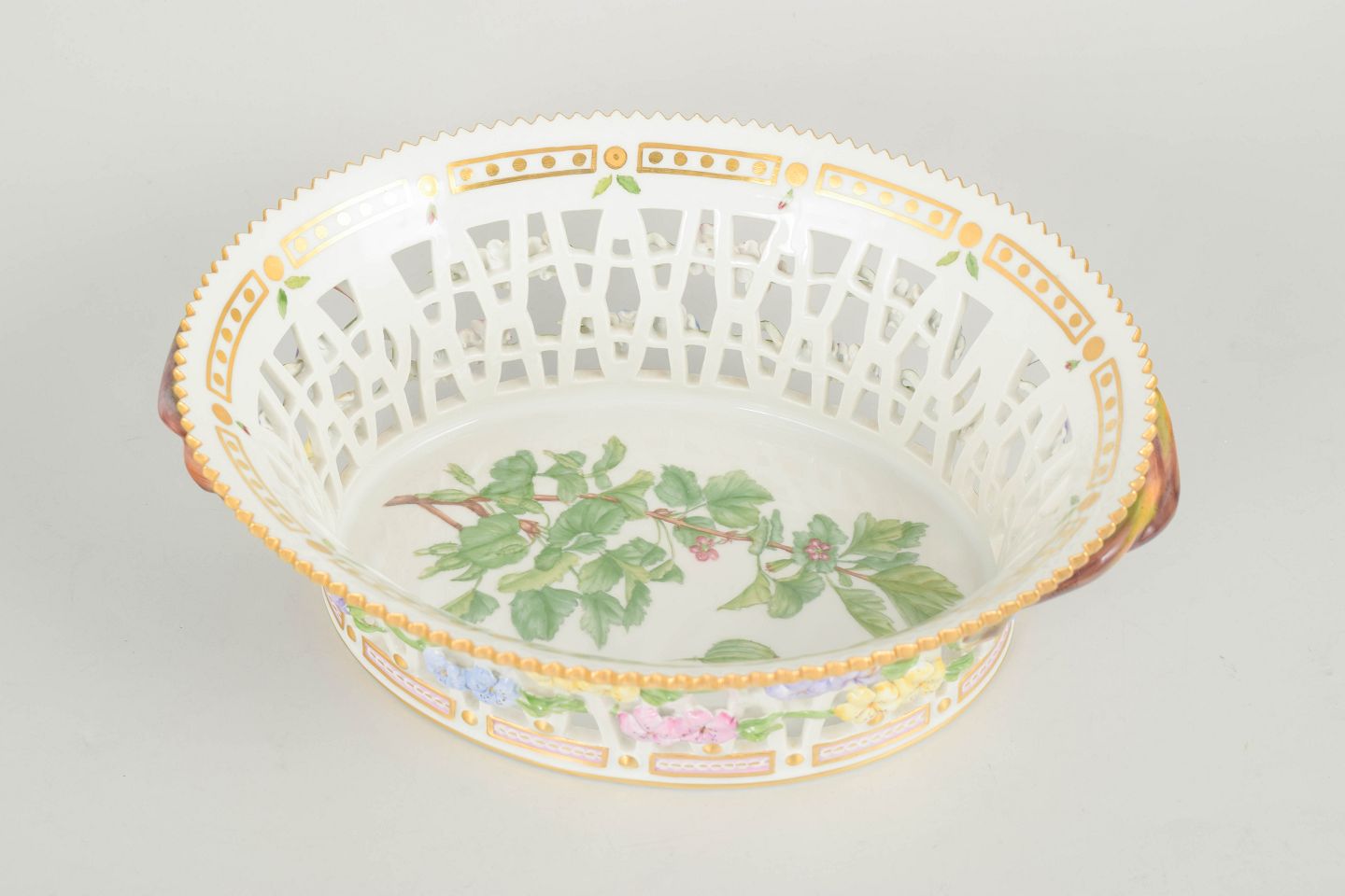 Royal Copenhagen Flora Danica basket.Open reticulated basket with pierced body and hand-painted botanical decoration from the Flora Danica series. Executed in porcelain with fine detailing and gilding. Model 20/3536, 1st factory quality, dated 1964.