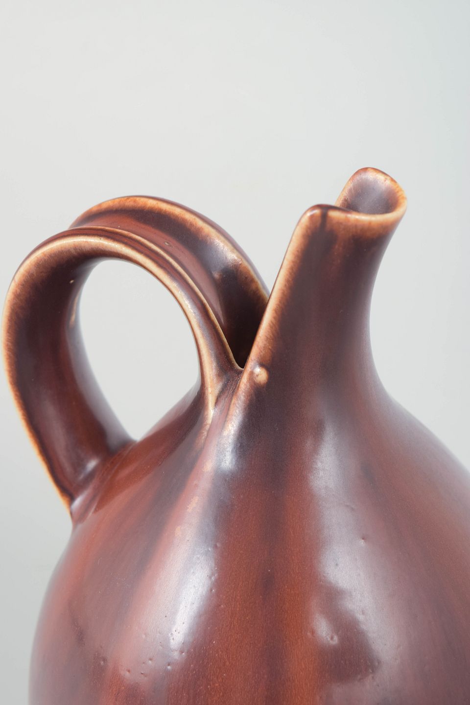 Organically shaped stoneware pitcher with rounded body, integrated handle and characteristic spout, executed in a deep reddish-brown glaze with warm tones.