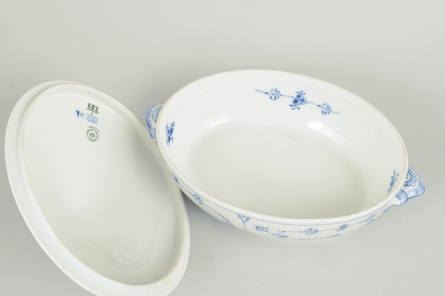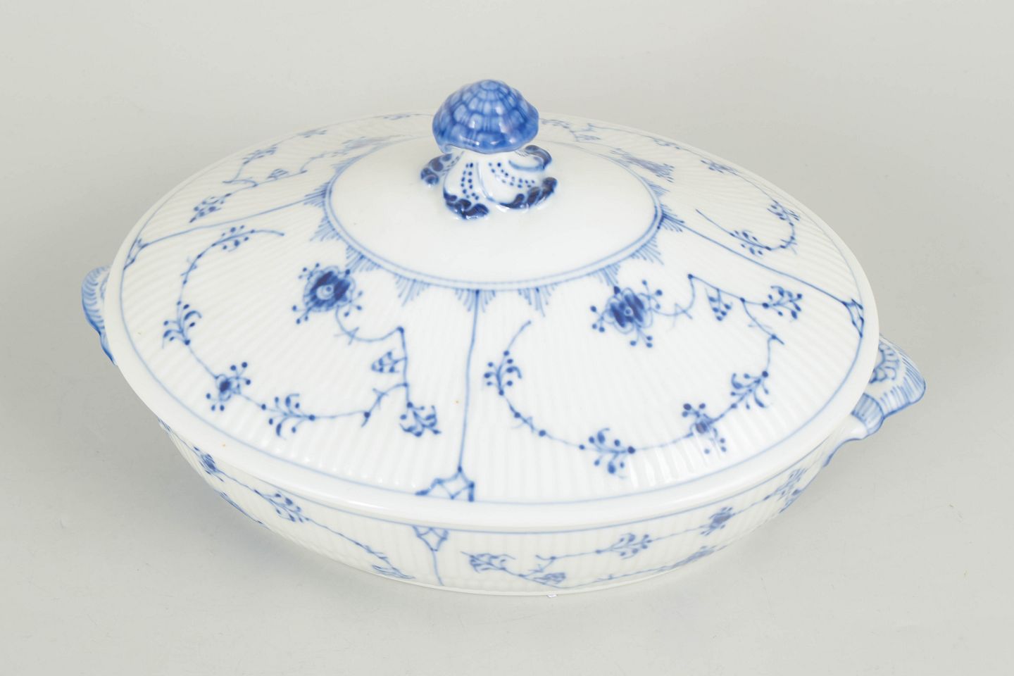 Royal Copenhagen, Blue Fluted Plain oval lidded tureen.Oval porcelain tureen with lid decorated in underglaze blue with the classic Blue Fluted Plain pattern. Model 1/283, first quality, dated 1967.