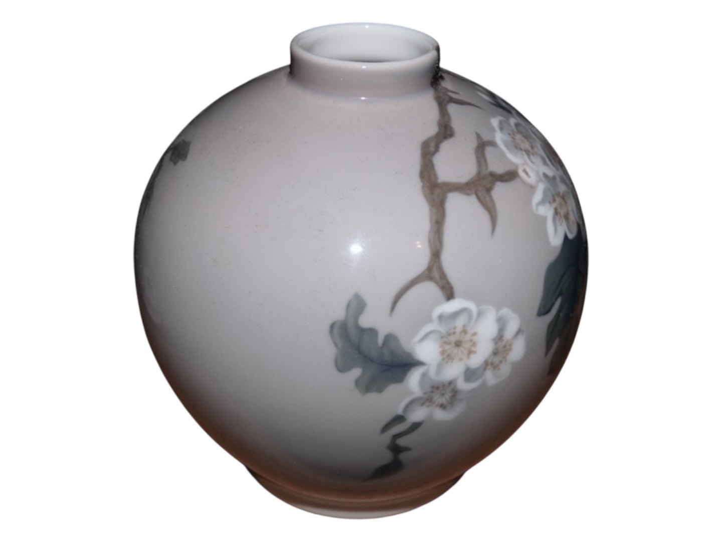 Small Bing & Grondahl round vase with white flower branches and a butterfly.