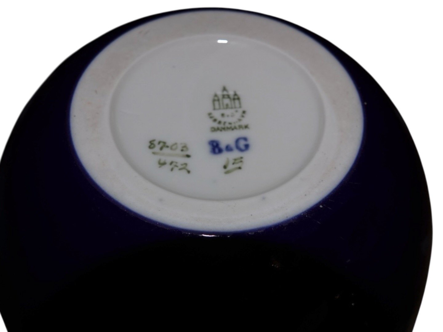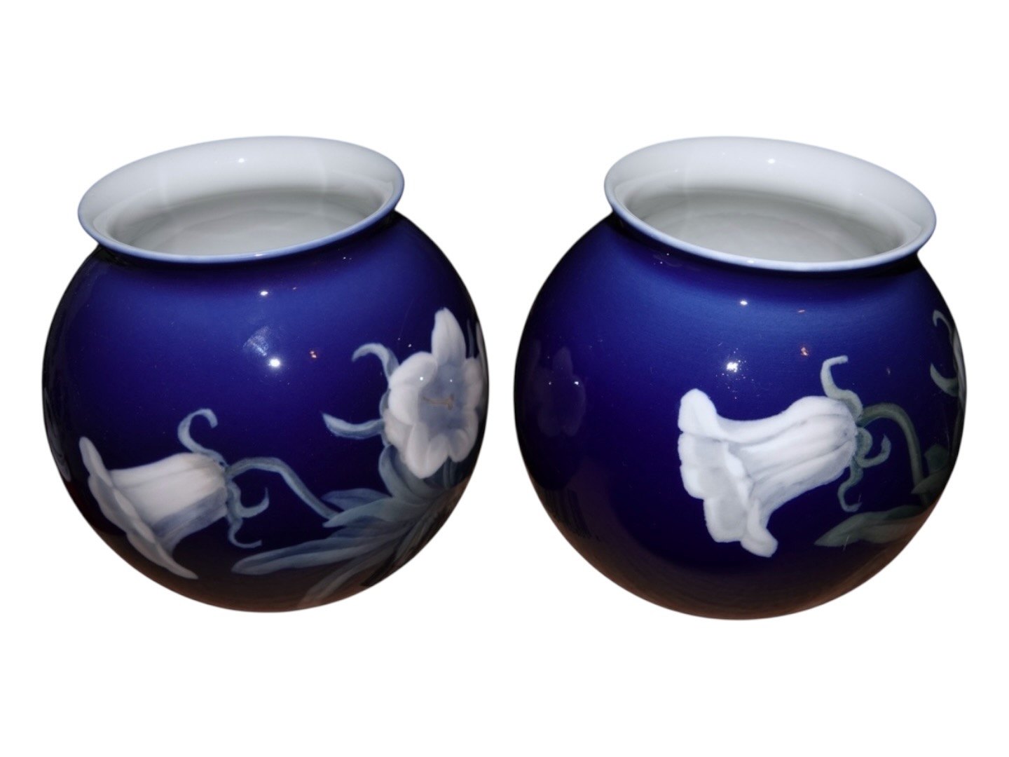 Bing & Grondahl two Art Nouveau dark blue vases decorated with white bindweeds.This product is only at our storage. It can be bought online or if you want to see it in our shop, then please call or email us. We can often have it in the shop the same day.