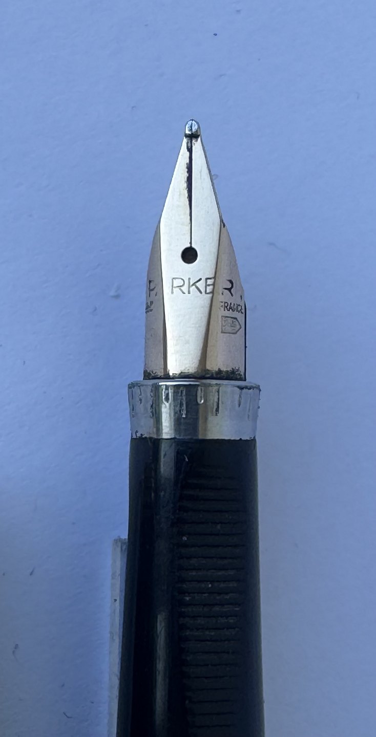Green striped Parker 75 Malachite Laquer fountain pen from around 1980. Made in France. All parts original including a 14 carat 585 gold nib. The striped decoration is partially erased on the side of the cap (follow the grey arrow in the photo). Otherwise in good condition without damage or repairs. A new ink cartridge must be inserted before it is ready to write again. L. 12.8 cm Dealer