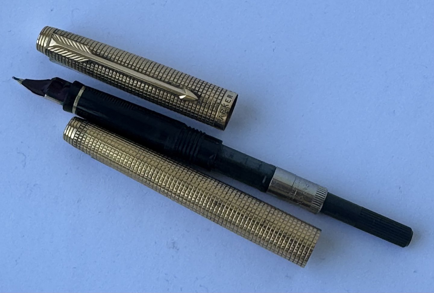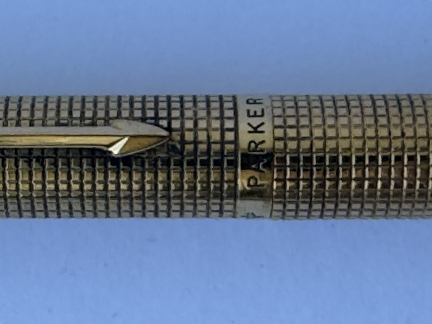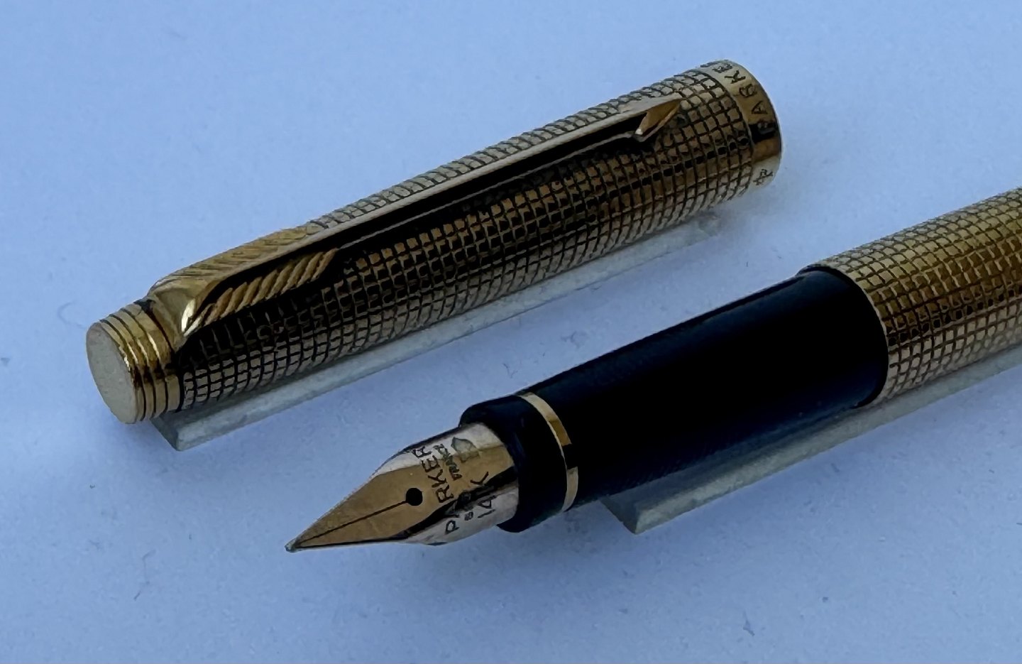 Parker 75 Cicelé fountain pen with checkered pattern on surface in gold-double. Made in the U.S.A. in the 1970s. Fully functional. Fine surface without bumps or other surface signs of wear. Need a good polish ! At the end a 14 carat 585 gold nib made in France. L. 13 cm. Dealer