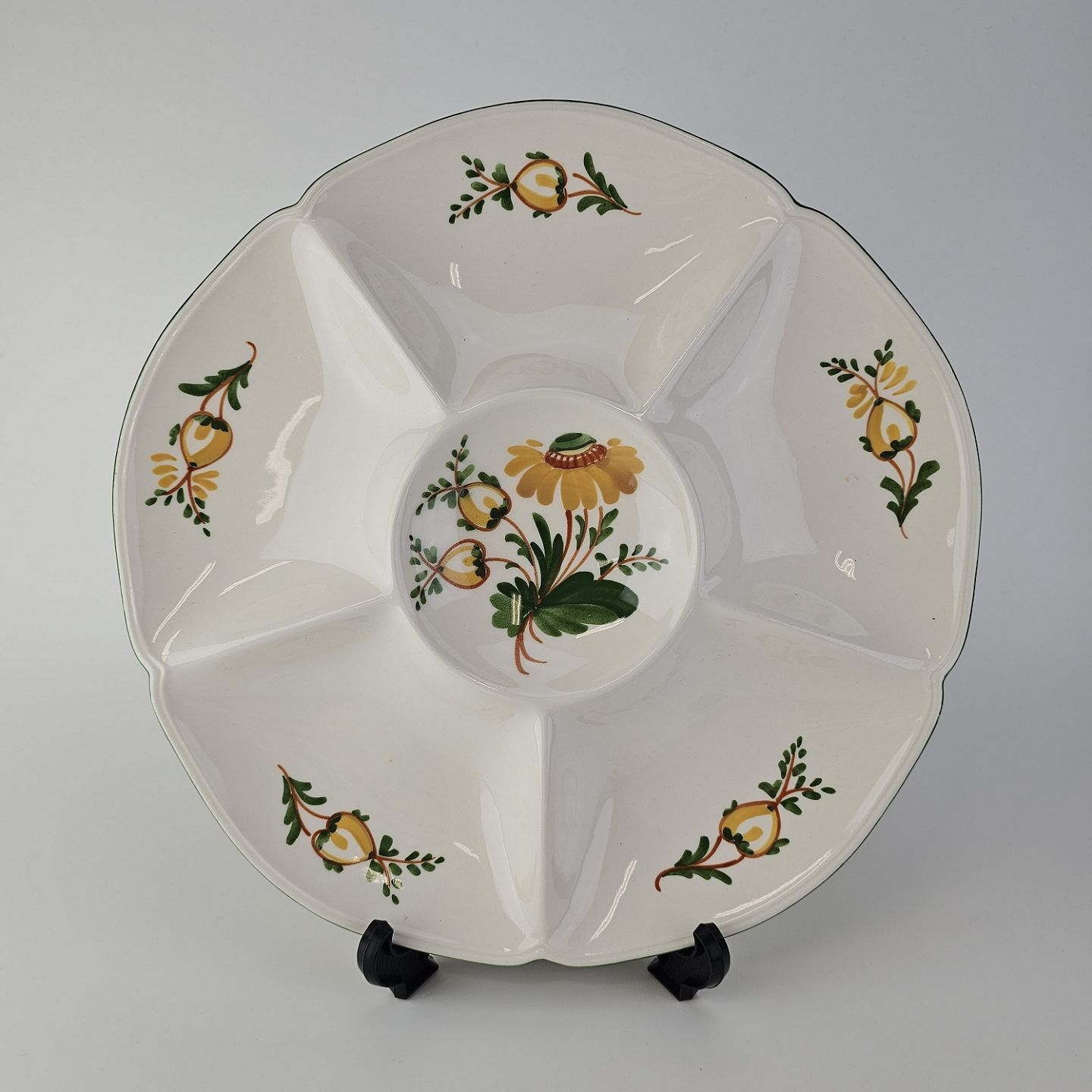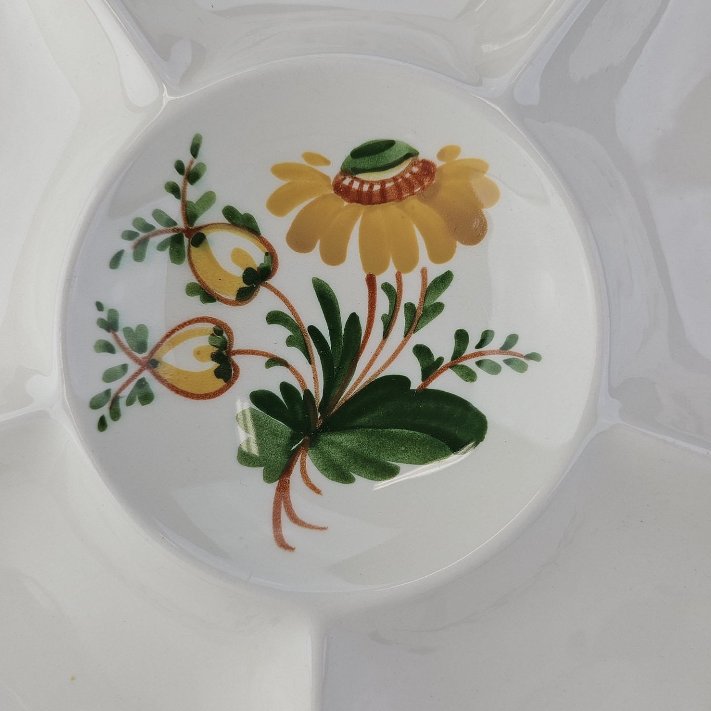Hvidt fajancestel i stelform Feston/Alma med motiv af gule blomster og grønne blade.