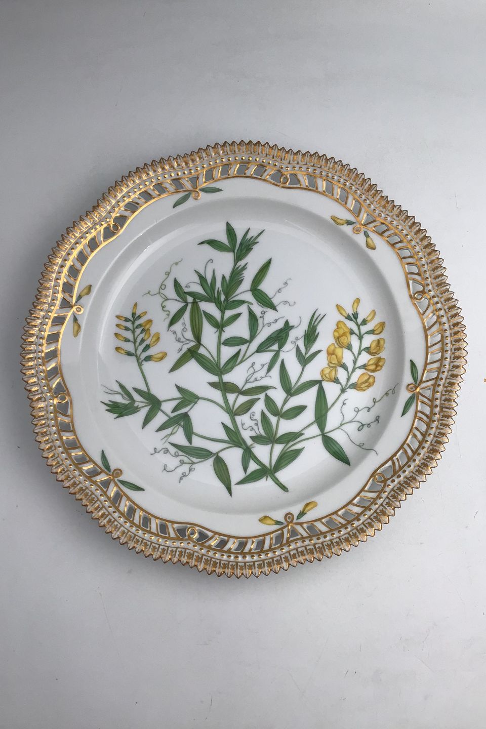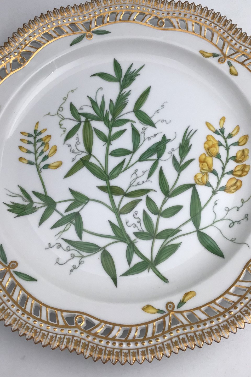 Royal Copenhagen Flora Danica Plate with pierced border No. 20/3526. Measures 27cm / 10.63 inch. 1st Quality Latin name: Lathyrus pratensis L.