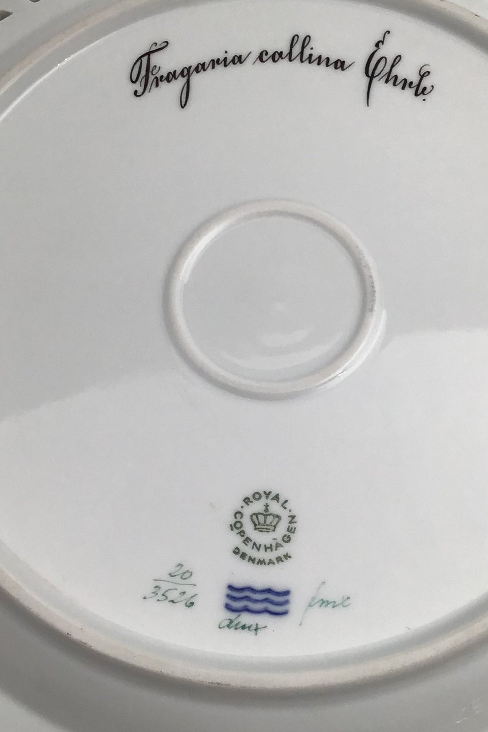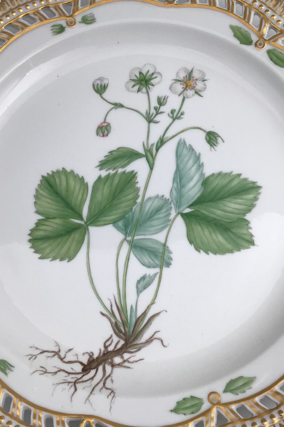 Royal Copenhagen Flora Danica Plate with pierced border No. 20/3526. Measures 27cm / 10.63 inch. 1st Quality Latin name: Fragaria collina Ehrb.