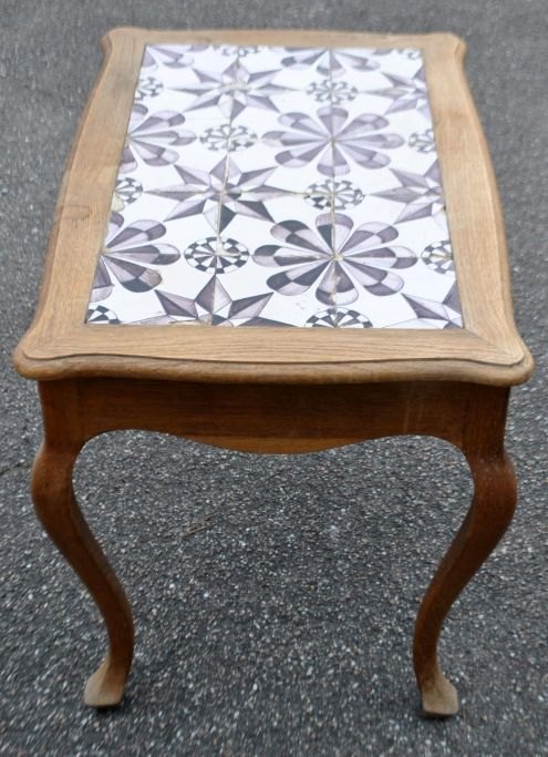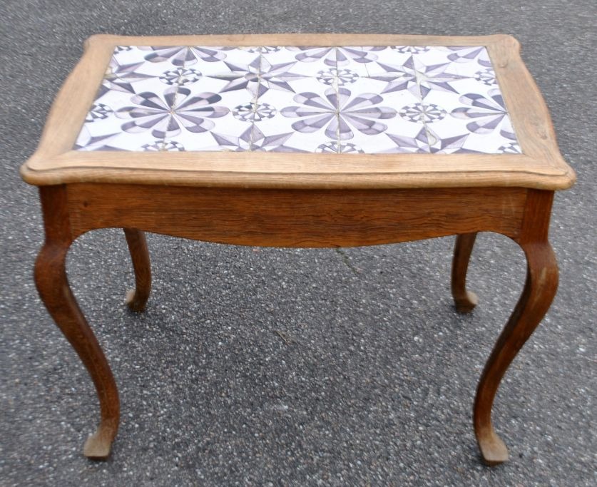 Tile table in oak, baroque style, 20th century. Denmark. H: 60 cm. L: 78 cm. W: 53 cm. 15 original star tiles in manganese from the latter part of the 18th century, Friesland.Item number: 29125