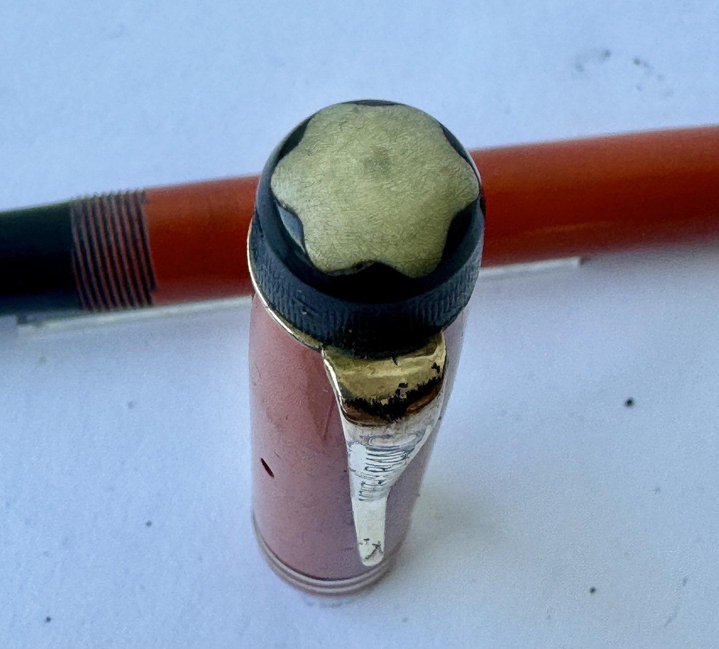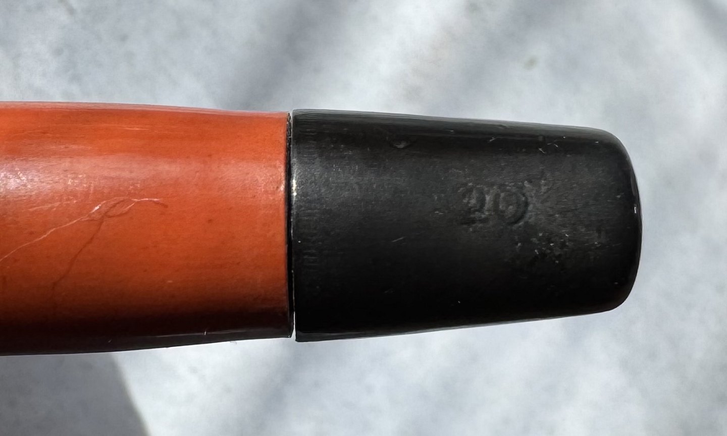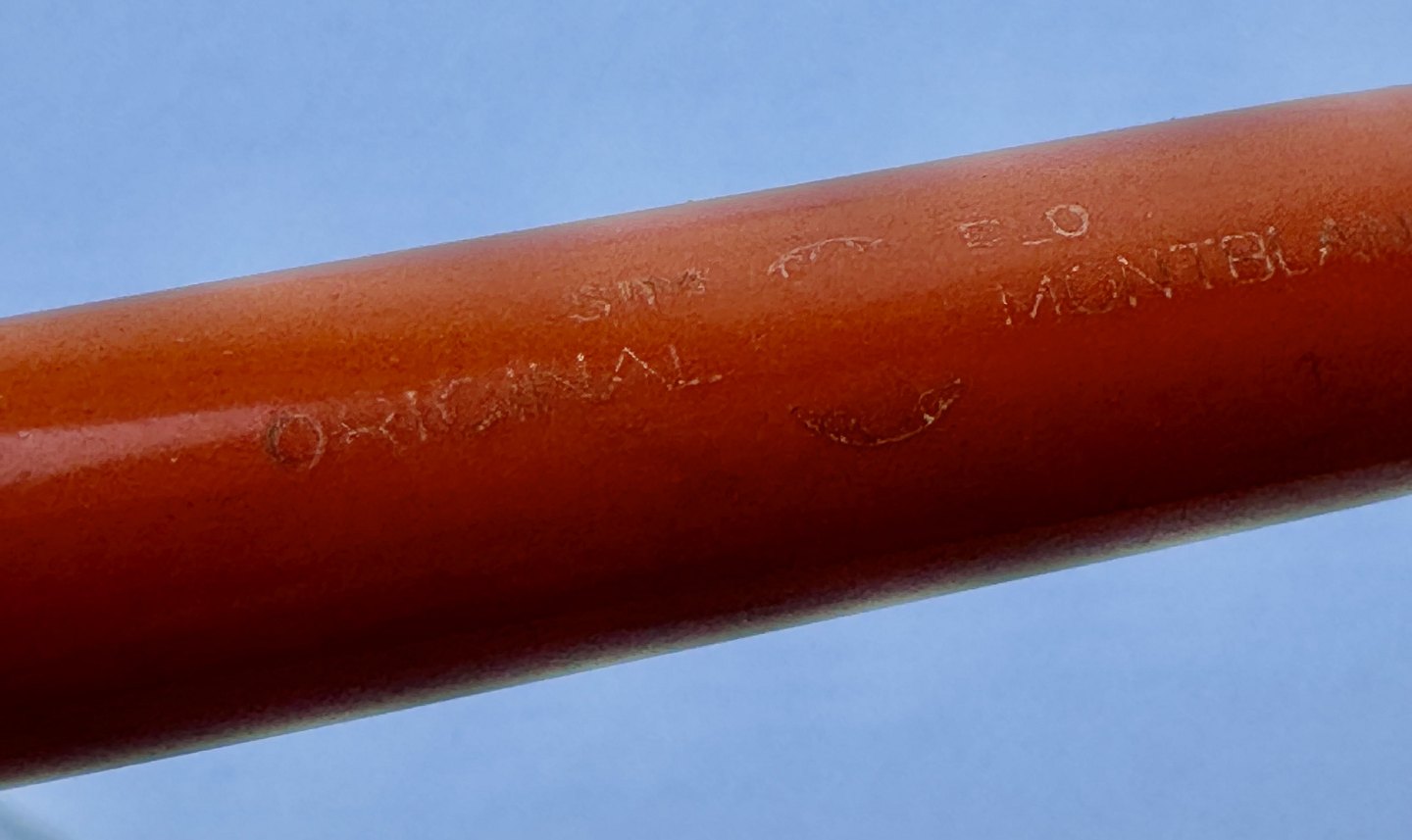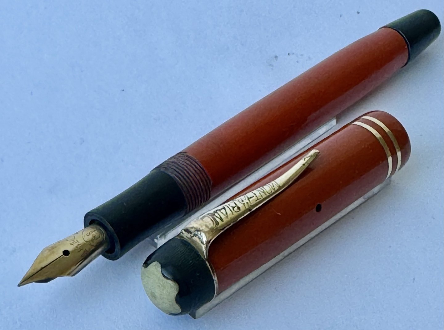 Coral red Montblanc Simplo Masterpiece no. 20 fountain pen. Push button filler. Produced inthe 1930s in Denmark. Slightly faded factory logo on the “body”. The end of the clip is broken. Otherwise no damage or repairs. All parts are original Montblanc from the period including the beautiful 14 carat gold nib. The fountain pen does not work. Dimensions: L. 13 cm Dealer