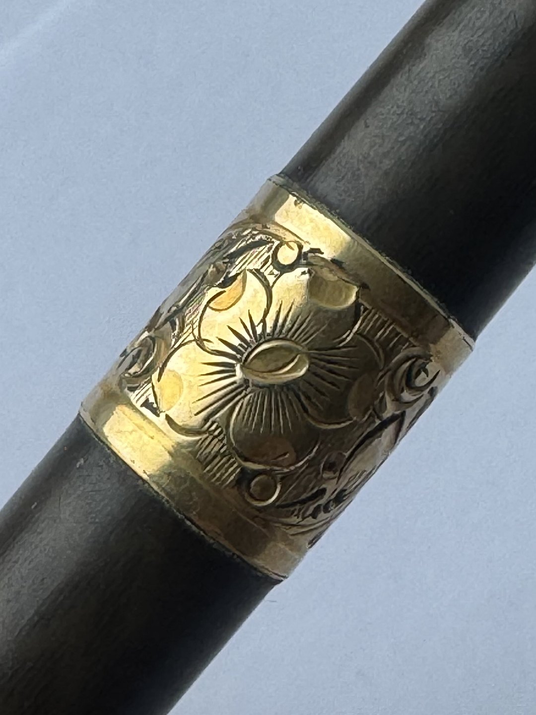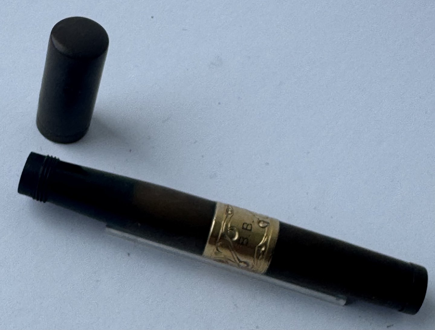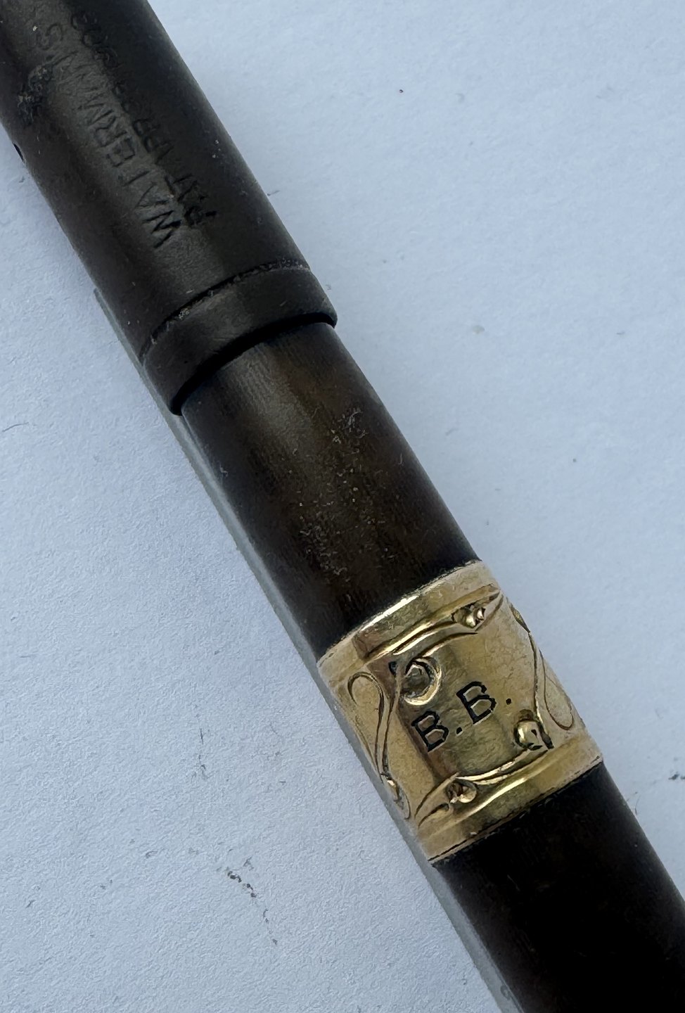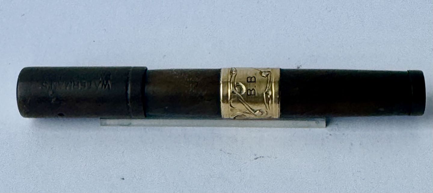 Black Waterman Safety fountain pen from 1903. Model number 42 1/2 V is engraved on the bottom on the pen (see photo). In the middle of the pen is a brass belt decorated with a flower and the owner's initials B. B. The original gold nib moves back and forth when the bottom screw is turned. The cap is engraved WATERMAN'S PAT.APR.28.1903. On the bottom, on the side, you can see faintly engraved WATERMAN and SAFETY. Appears in good condition without damage or repairs. Slight discoloration. Length: 8.7 cm Dealer