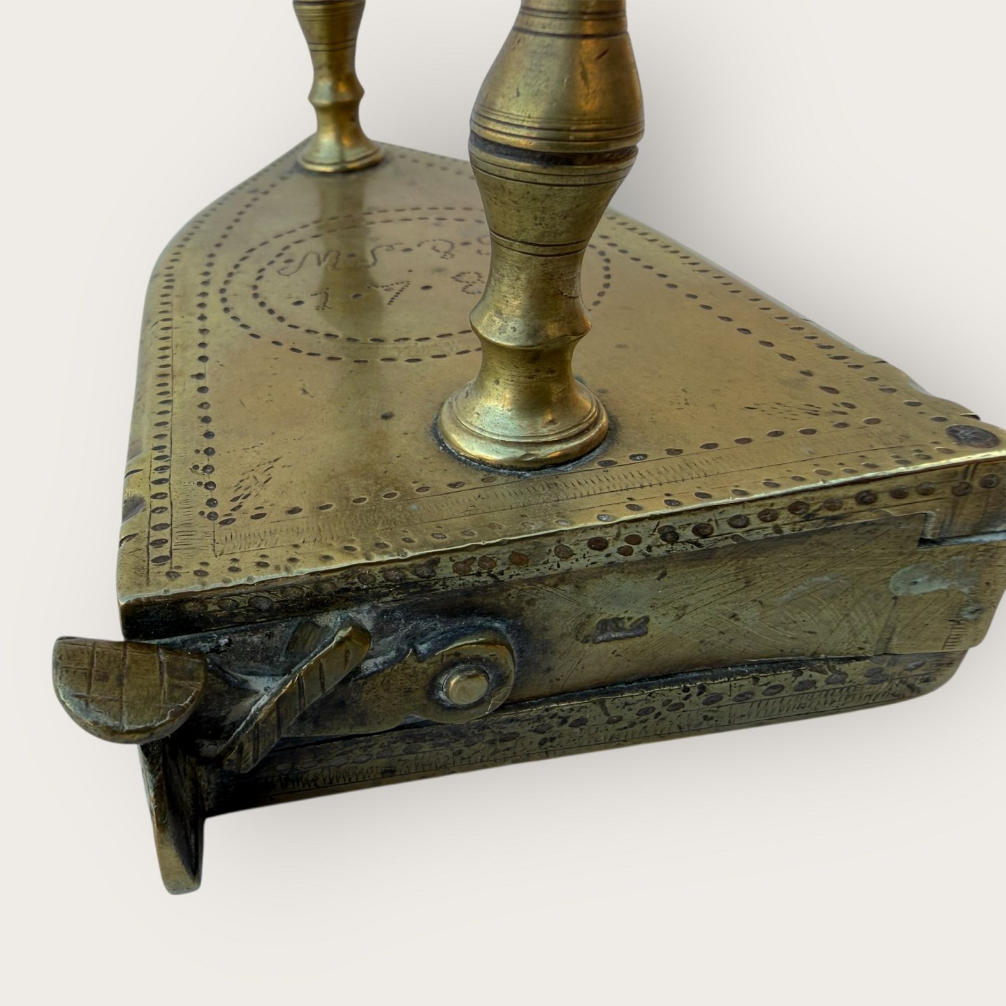 Brass iron, marked with owner's initials and 1784, Dimensions approx.: HxLxW 11x14x8cm *Good used condition*Stock: 1
