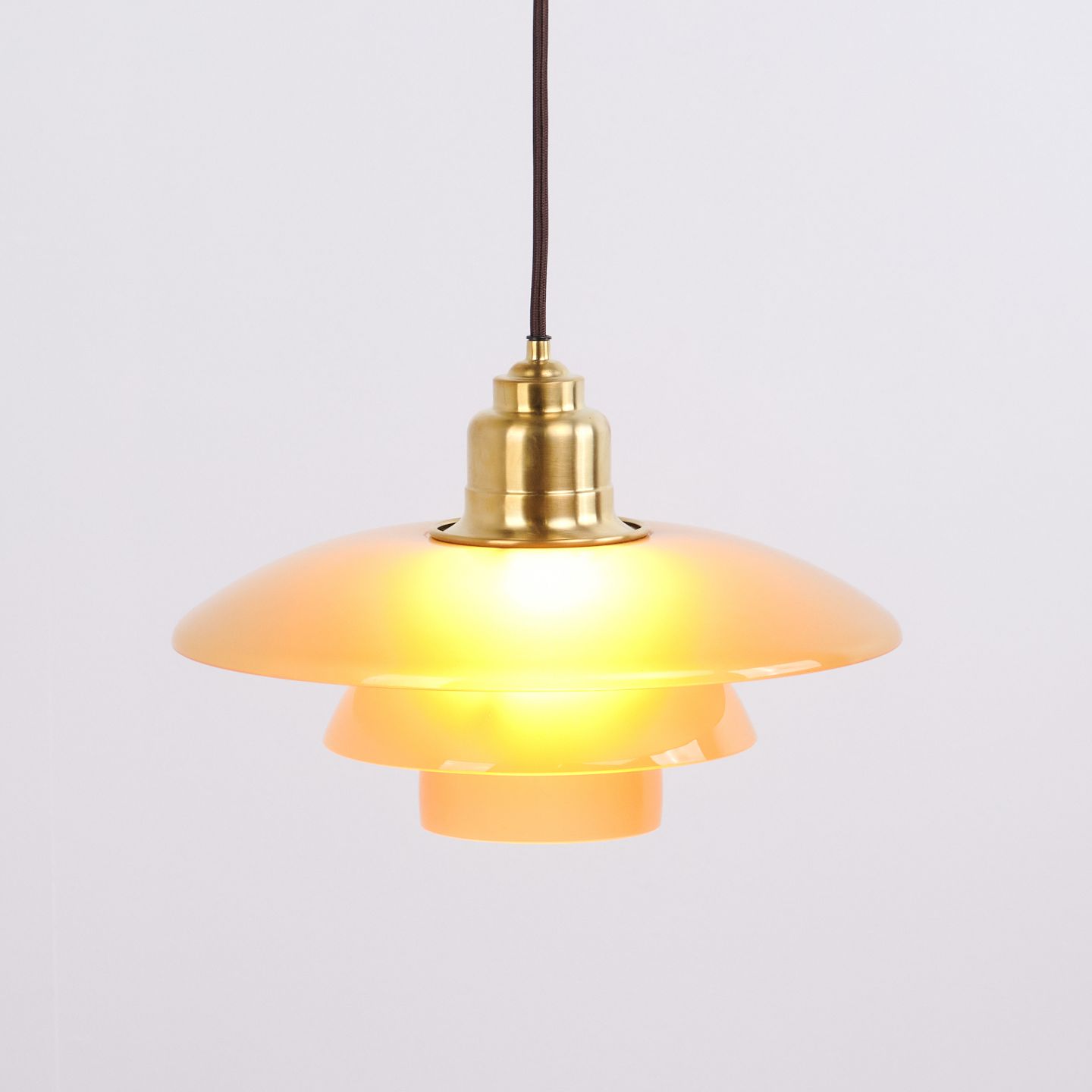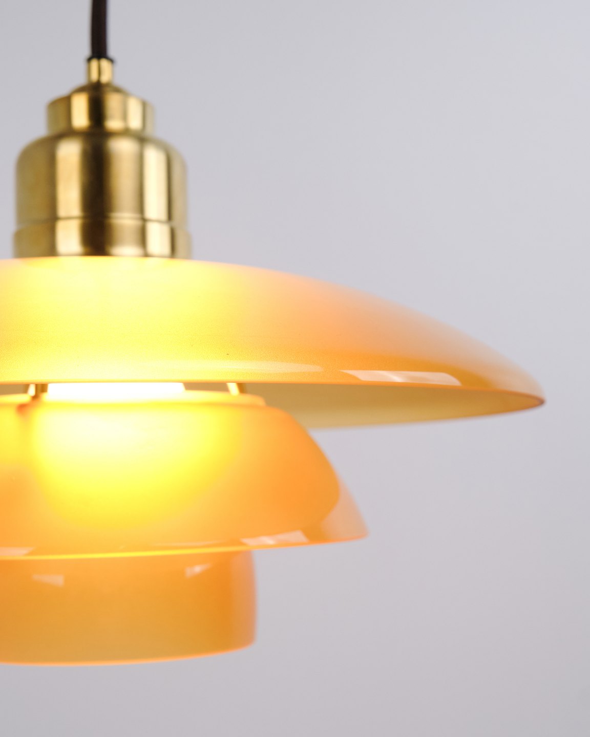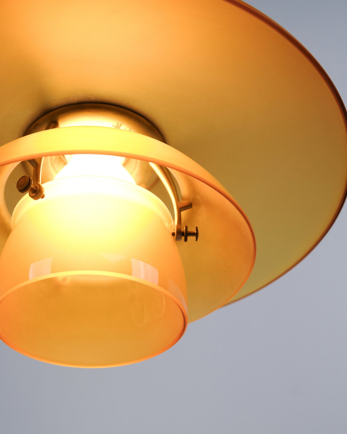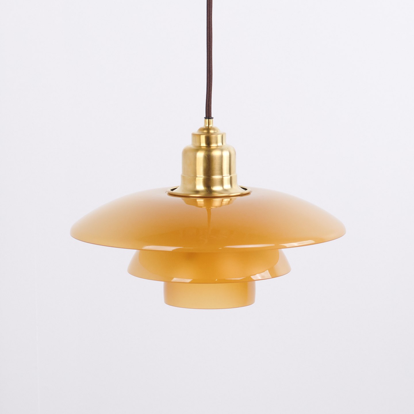 PH 3½-3 pendant designed by Poul Henningsen and released as a Limited Edition in 2017 by Louis Poulsen. The lamp features amber-coloured glass shades, creating a warm and atmospheric light. The model was only produced and sold for a short period, making it particularly sought after.— Origin: Denmark