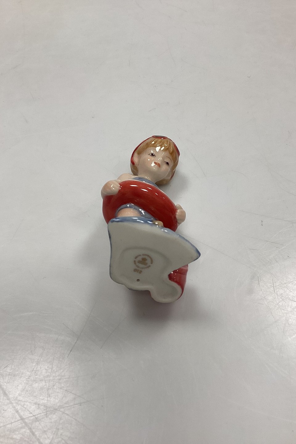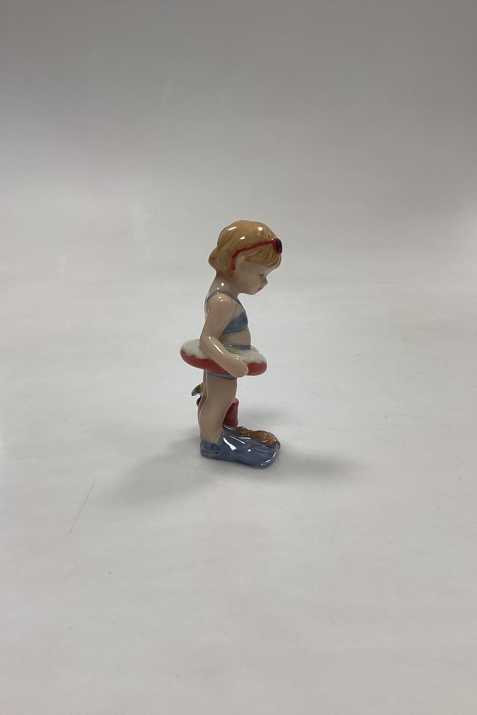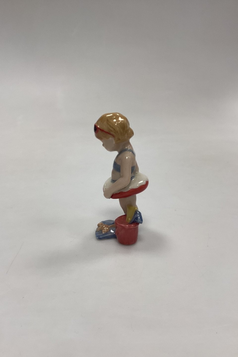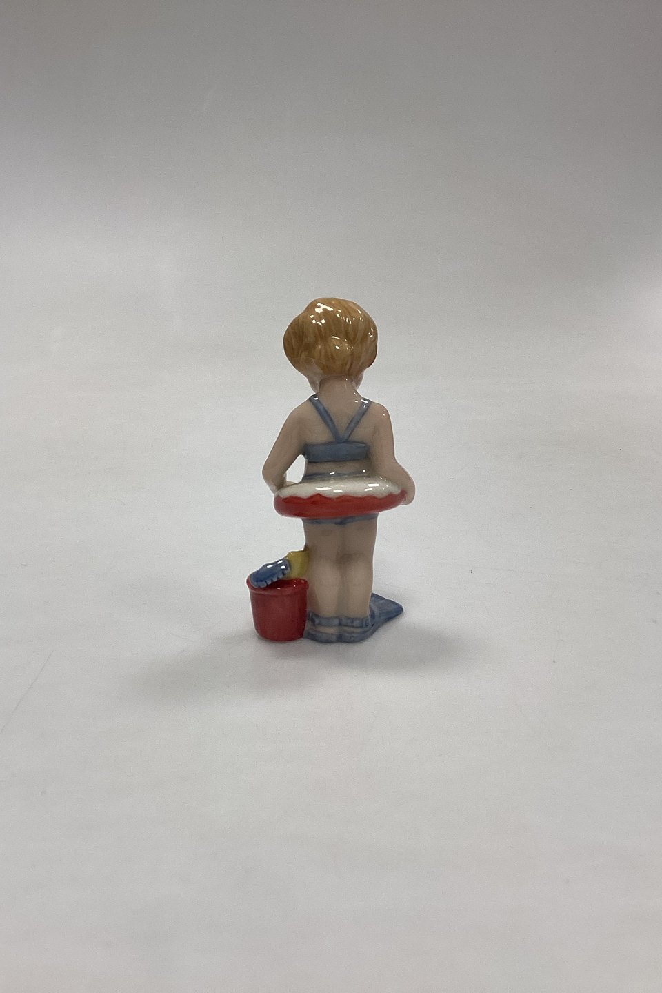 Royal Copenhagen Mini Collection Figurine Toddler - Christina No. 012. Girl with swimming ring, bucket and flippers. Designed by Sven Vestergaard.Measures 9.5 cm / 3.74 in.