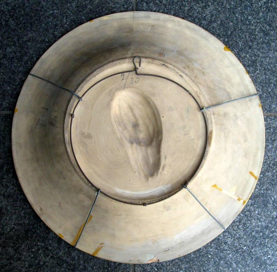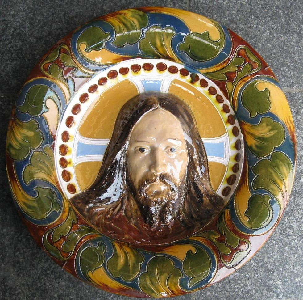 Danish ceramist (19th century) Denmark: Christ. Red clay with glaze. In the colors green, brown, blue, white and light blue. Not signed. Dia.: 40 cm. On the back various pencil drawings, indicating prices in dollars. The work has probably been exhibited in the USA. With repairs.Item number: 7766