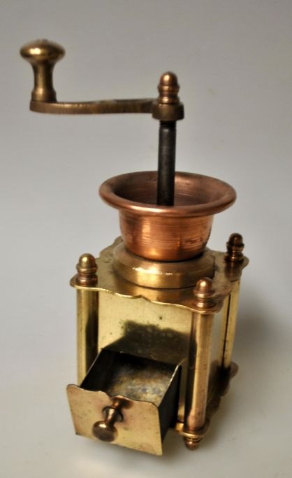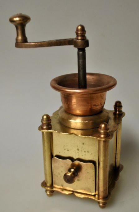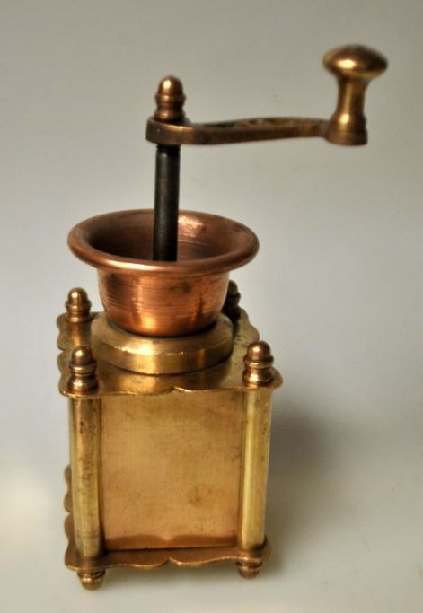 Small antique coffee grinder in brass/copper, 19th century. Denmark. H.: 18 cm. With funnel, turning handle and drawer for collection.Item number: 29022