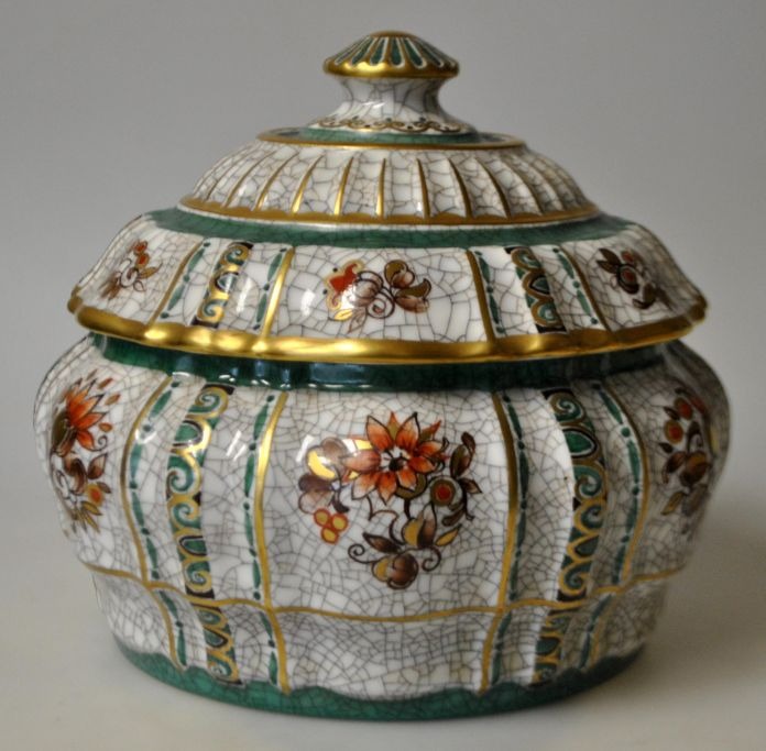 Dahl Jensen lidded jar in craquelle, 241/704, 20th century. Copenhagen, Denmark. Hand-painted floral motifs, greenery and gilding. H: 16 cm. Dia: 19 cm.