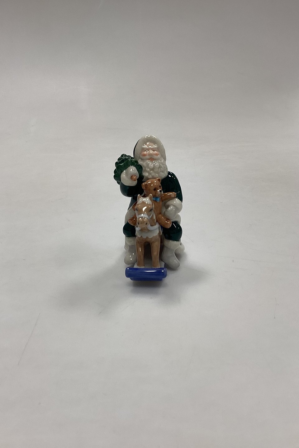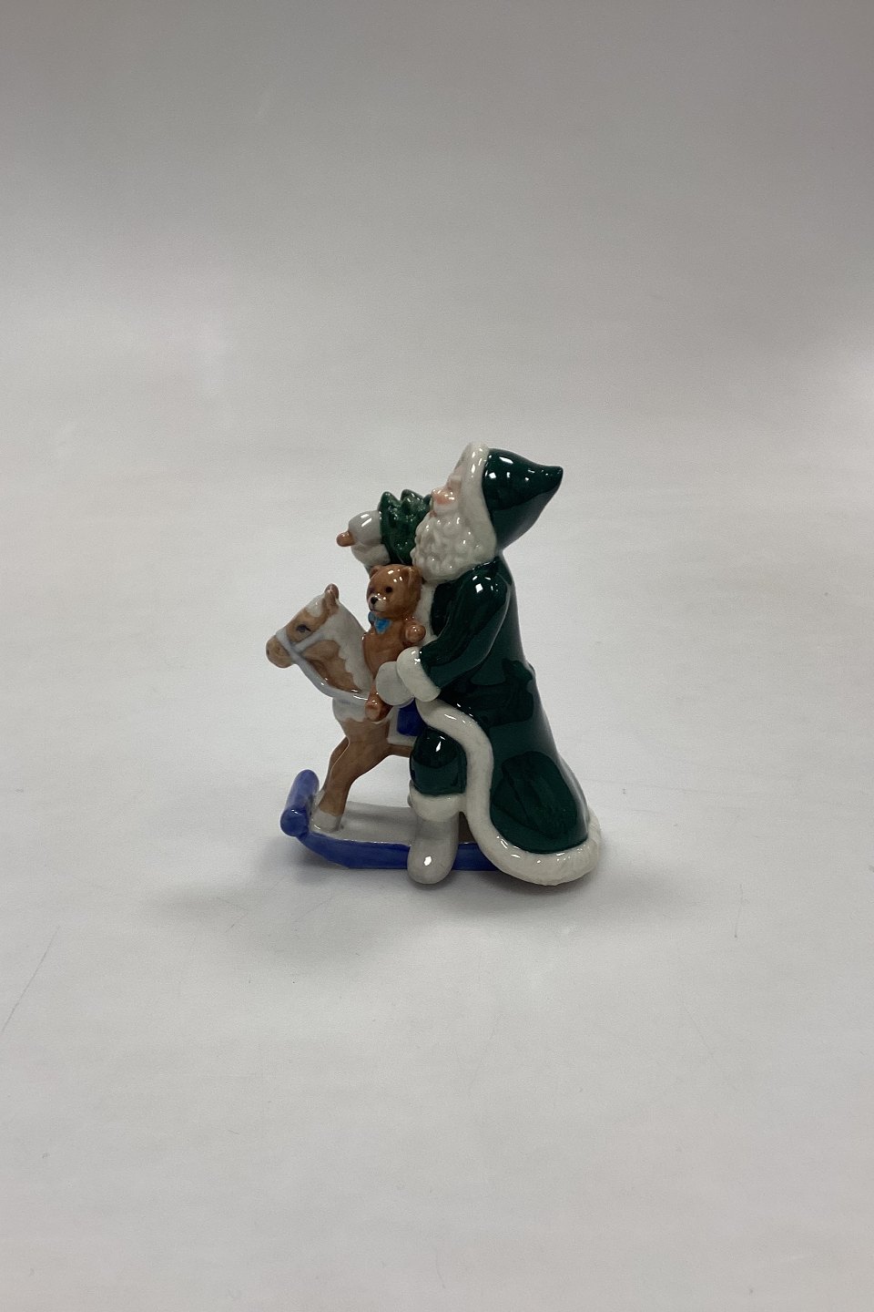 Royal Copenhagen Figurine Santa Claus of the Year 2005 No. 771. Santa Claus in green clothes on a rocking horse. Designed by Sven Vestergaard.Measures 9 cm / 3.54 in.