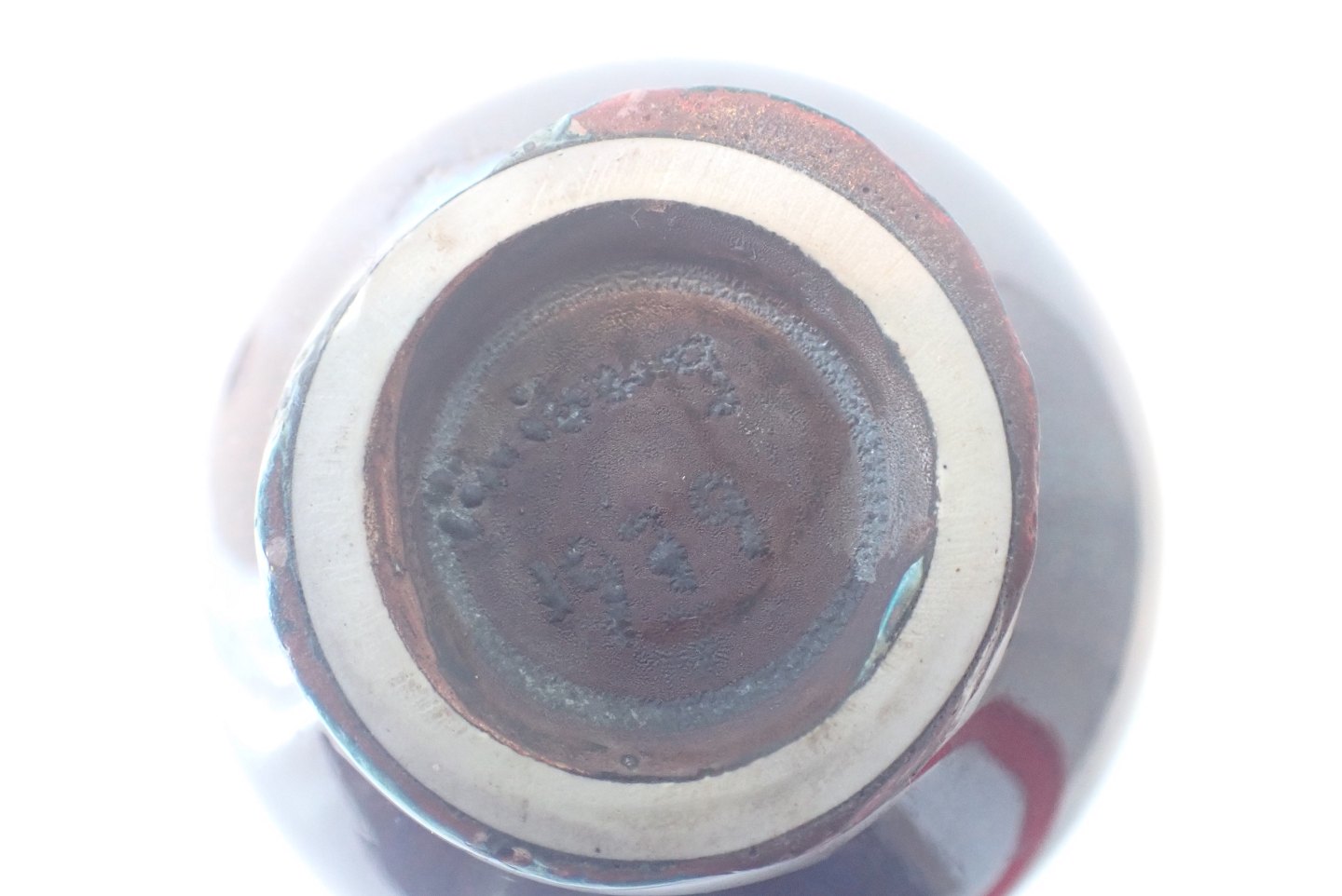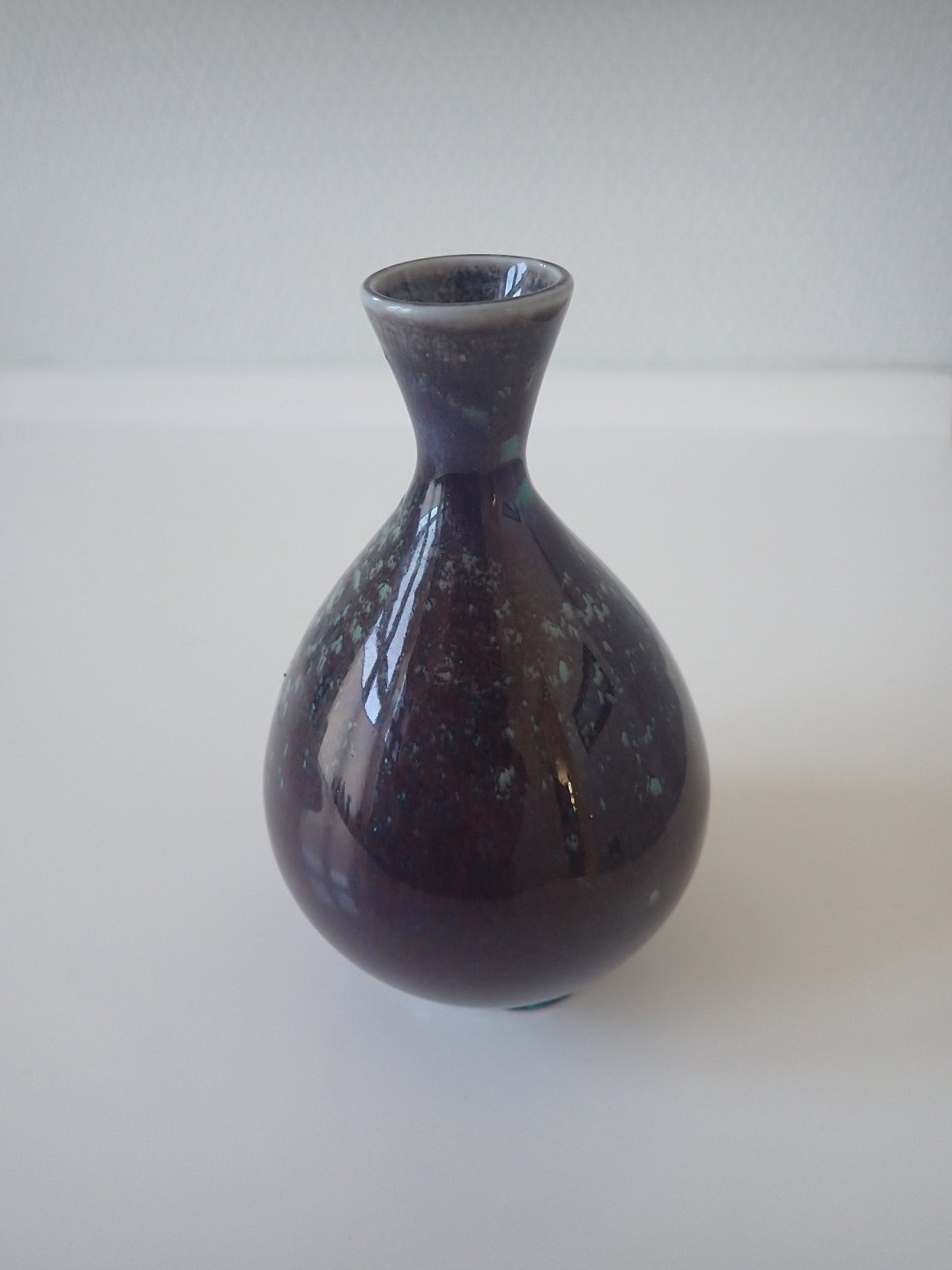 Berndt Friberg (1899 - 1981) - Lille, dråbeformet vase i stentøj med blank grøn/brun/blå spættet glasur. Gustavsberg. Stemblet Friberg 79. Højde: 11,7 cm. Bredde: ca. 7 cm. I fin stand men med oprindelig sleben bund. Dealer
