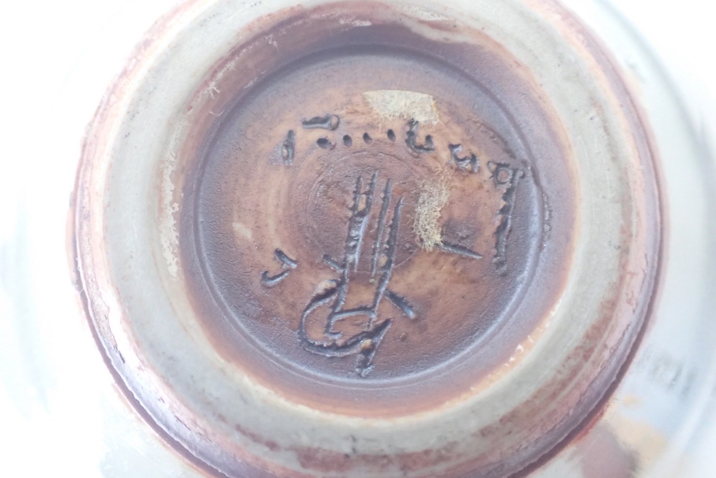Berndt Friberg (1899 - 1981) - buttet vase i stentøj med lille krave med blank grøn/brun/sort spættet glasur. Stemplet Friberg, J (1968), Studio-hånd fra Gustavsberg. Højde: 10,7 cm. Bredde: ca. 10,5 cm. I fin stand.