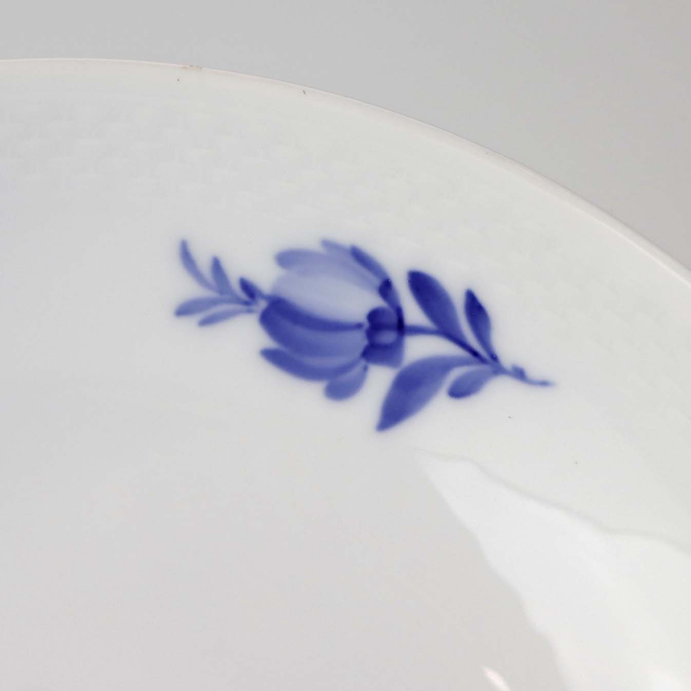 Service i glat hvidt porcelæn med flettet kant og dekoration af blå blomster.