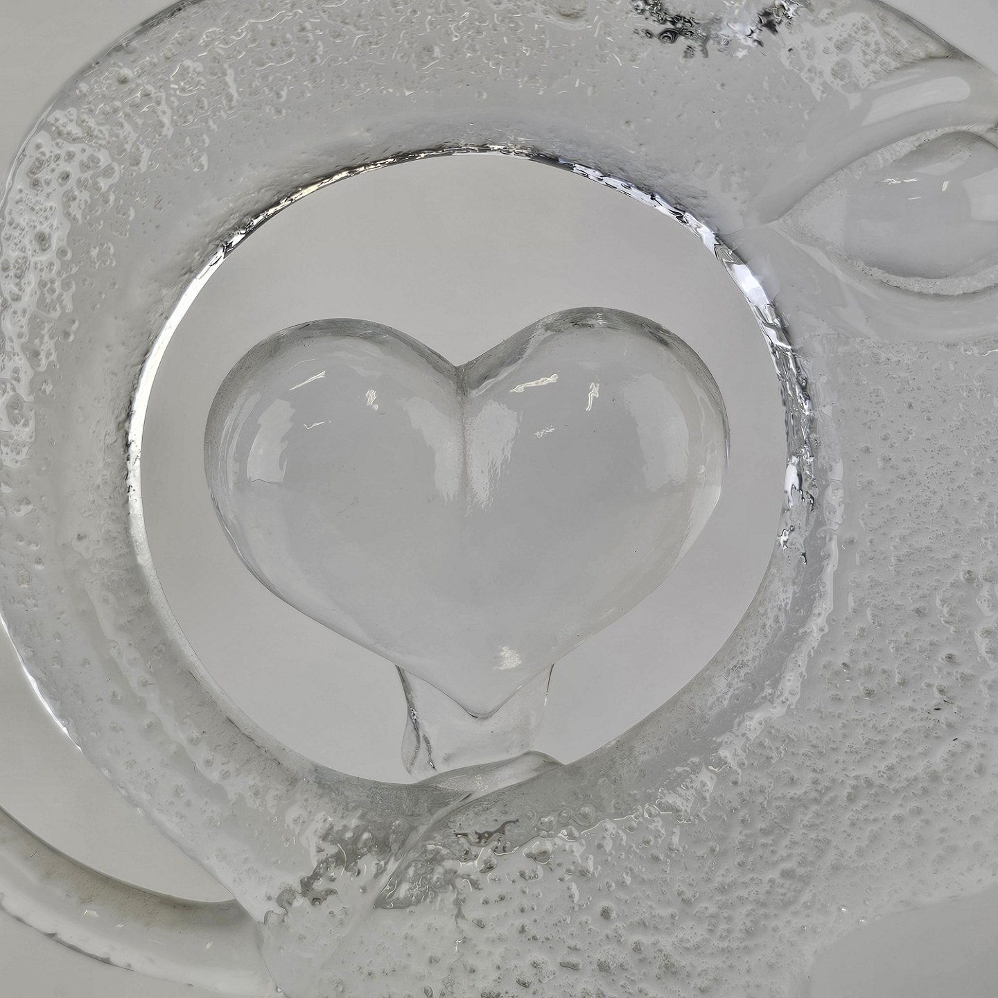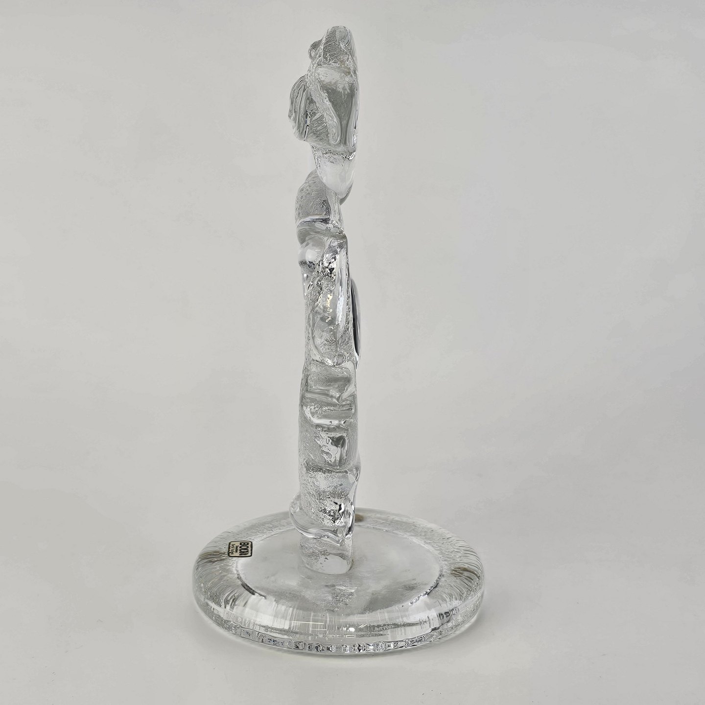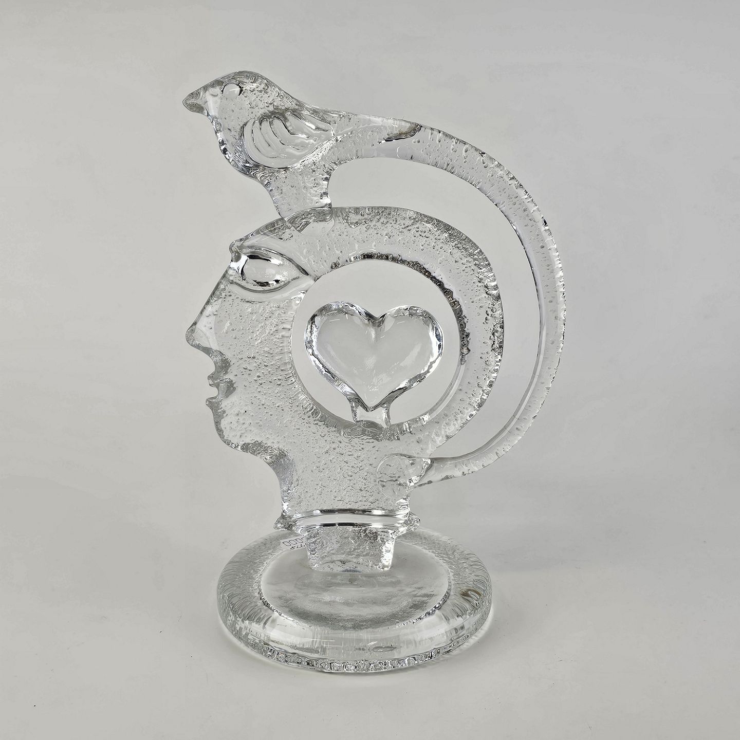 Skulptur i glas med motiv af et menneske i profil, en fugl og et hjerteFormgiver Bertil Vallien