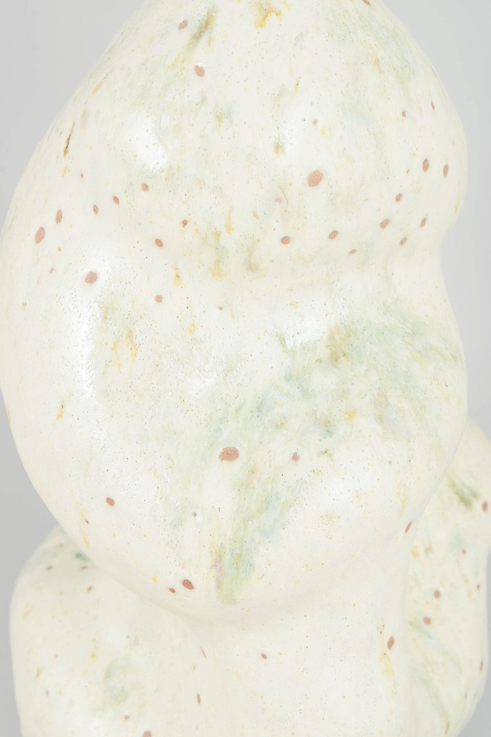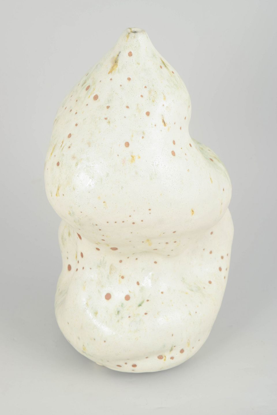 Christina Muff, Danish contemporary ceramicist (b. 1971).Large hand modeled, organic shaped, vessel with a pointed top. The vessel is covered in spots that show the warm brown stoneware clay through the cream and green matte glaze.