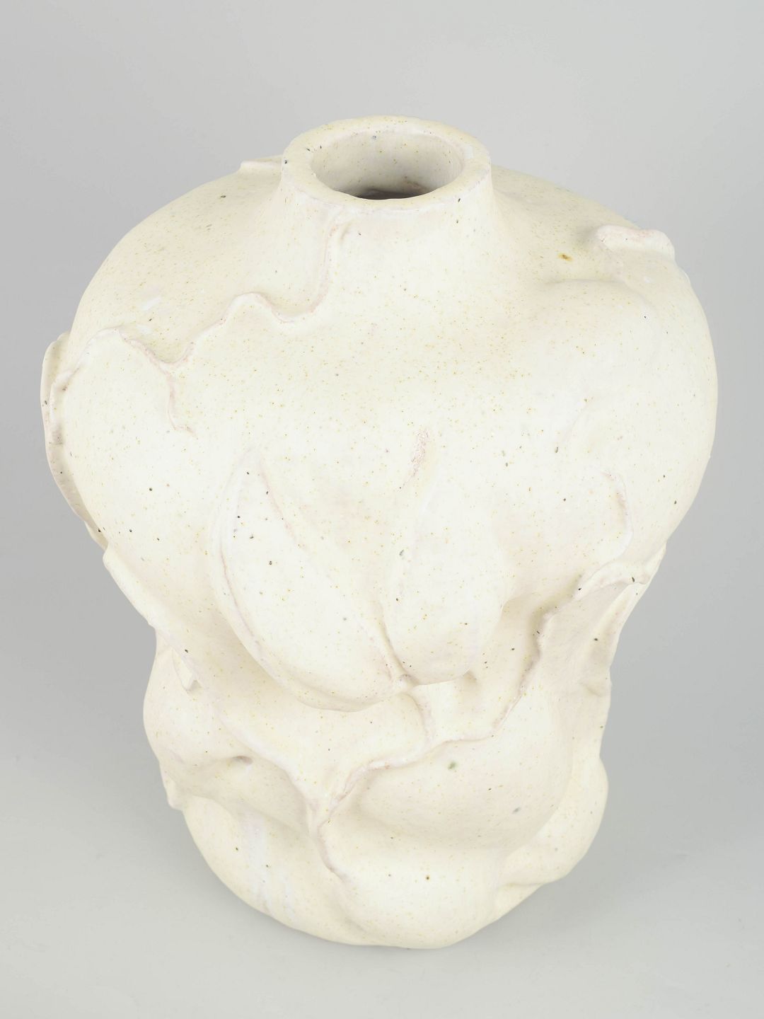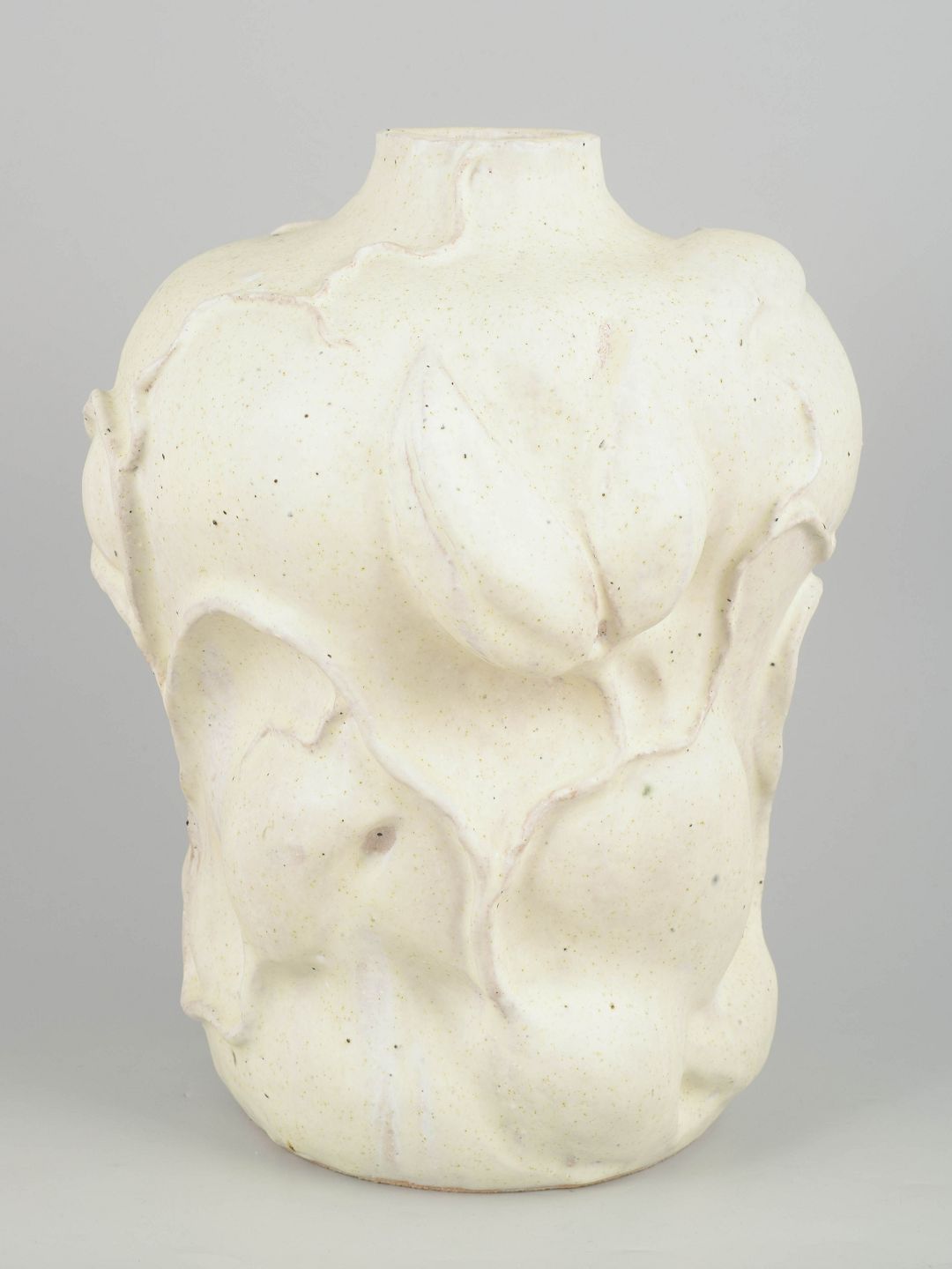 Christina Muff, Danish contemporary ceramicist (b. 1971).Large hand modeled, organic shaped, vessel with a flower motif. The vessel is covered in a matte cream-beige glaze.