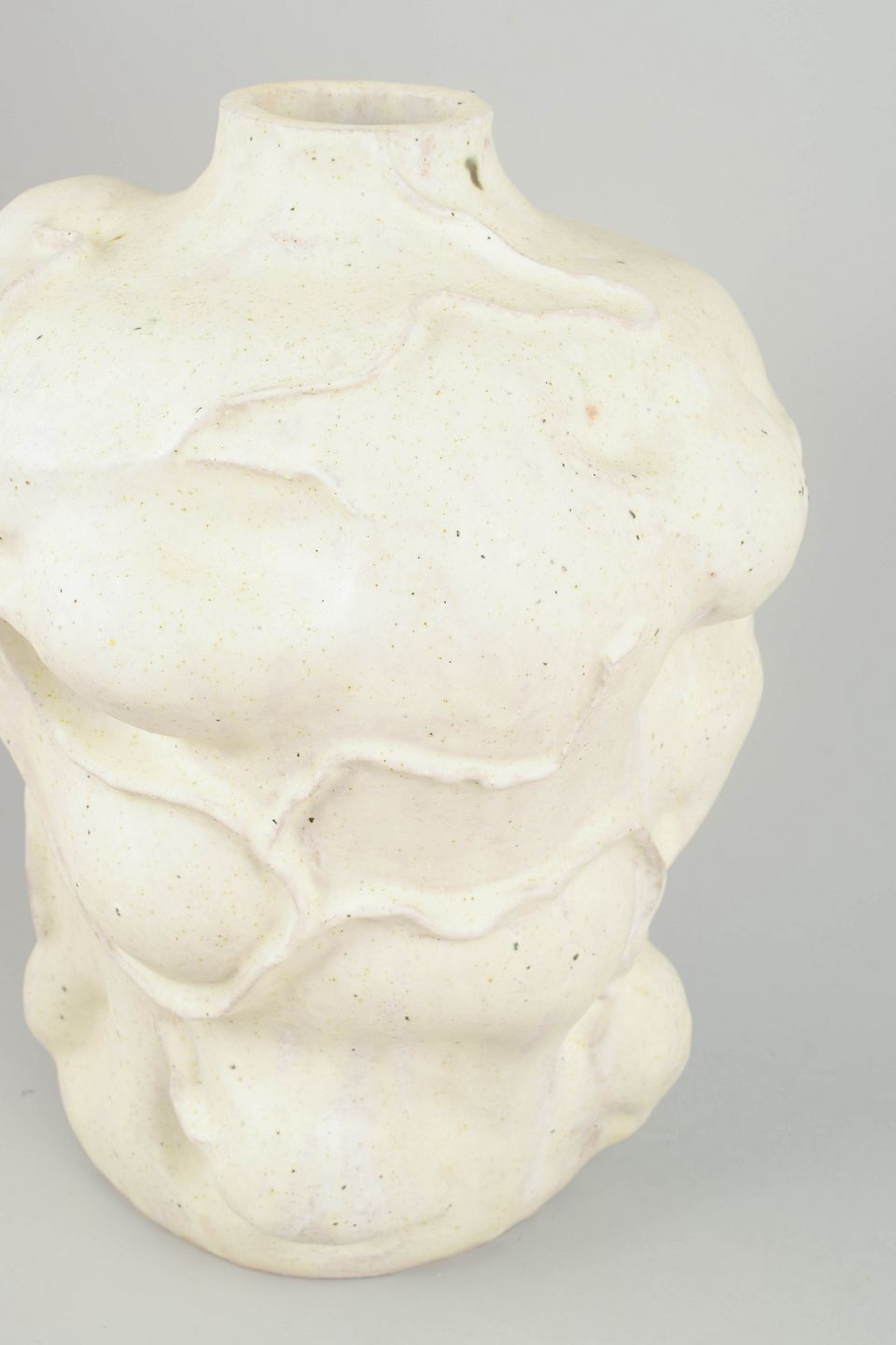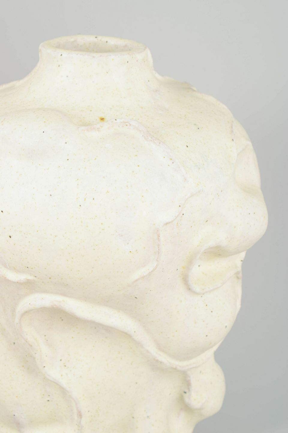 Christina Muff handcrafts her clay sculptures using techniques such as slab building and coiling. Large surfaces of clay are slowly shaped into detailed sculptures with complex, naturalistic forms. It is a time-consuming process, as the sculptures—due to their size—require a long drying period before being fired, often multiple times, to achieve the desired texture and color. During the glazing process, she uses a variety of techniques in combination with natural materials such as sand, chalk, and locally dug clay from Denmark. The goal is to create textures and surfaces that resemble man-made objects reclaimed by nature.