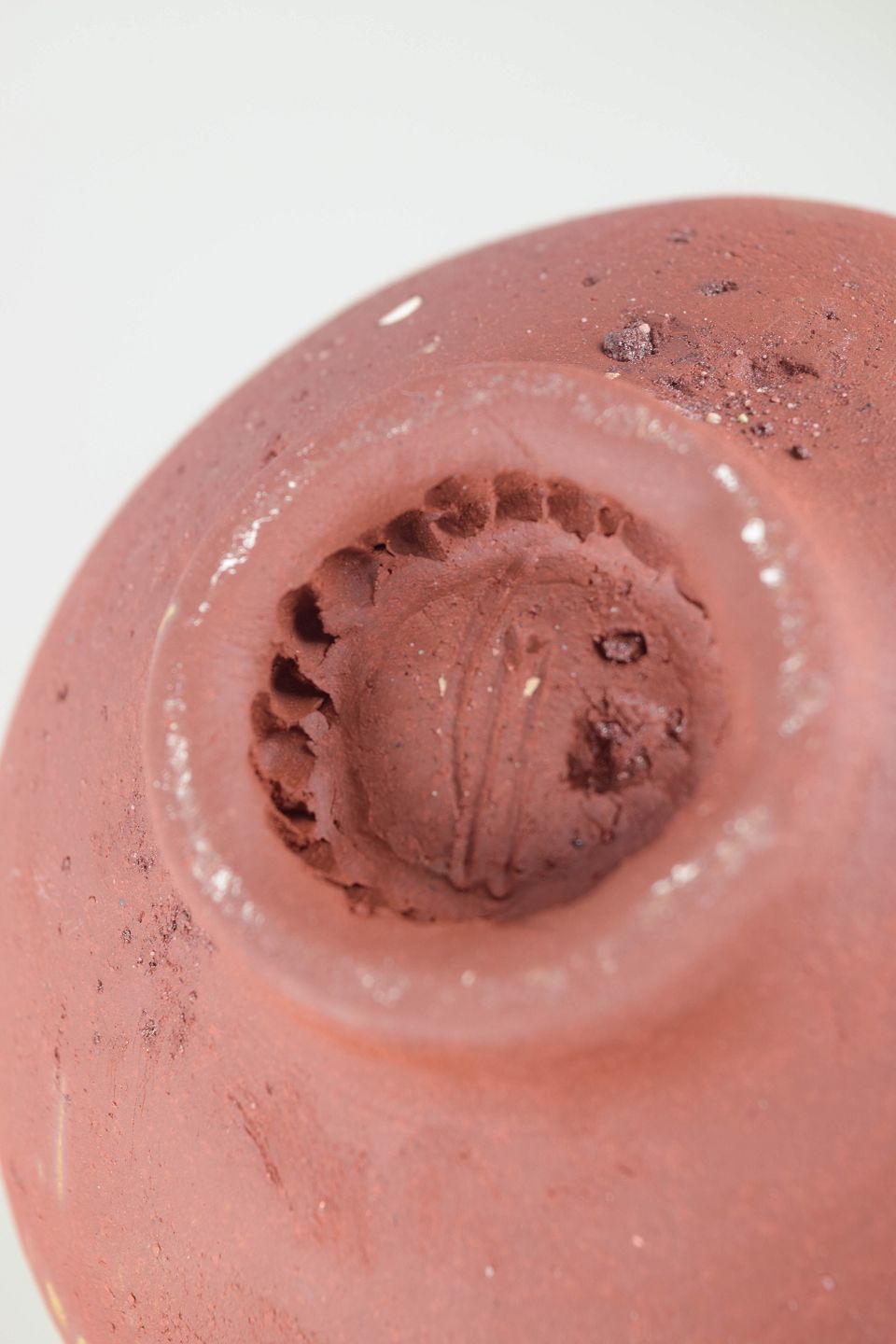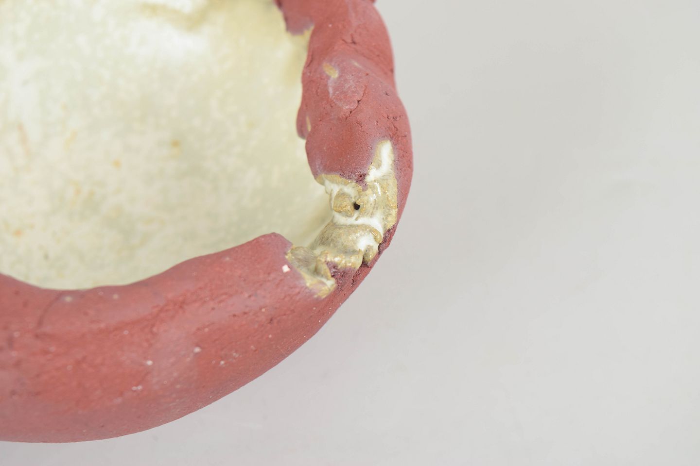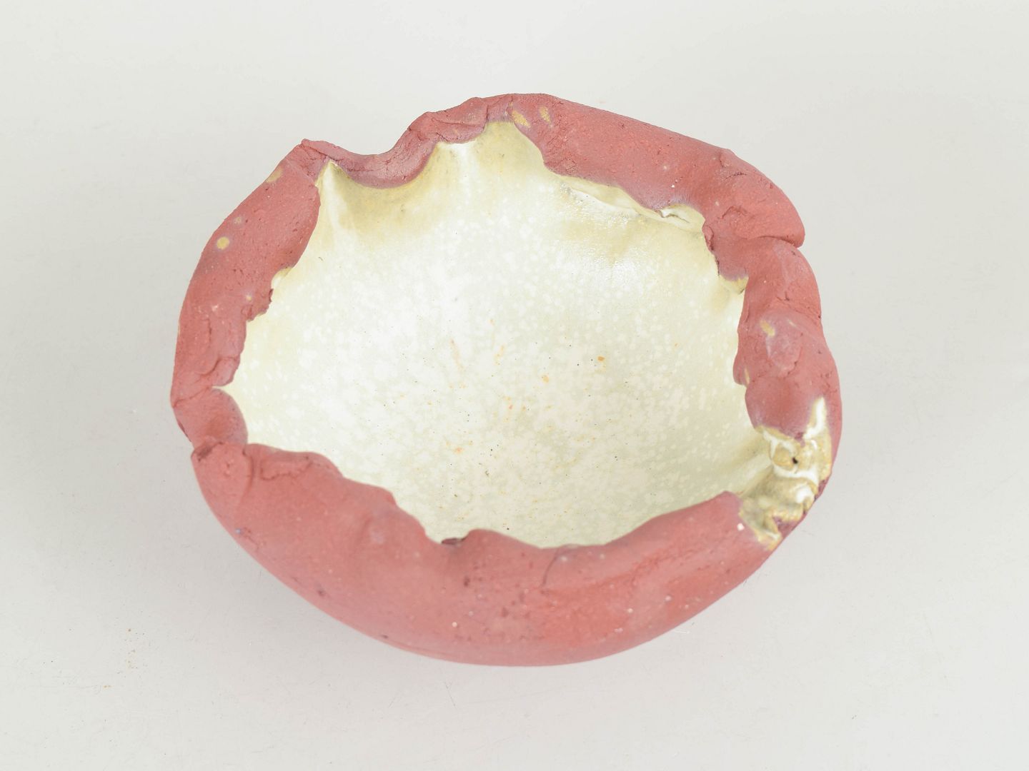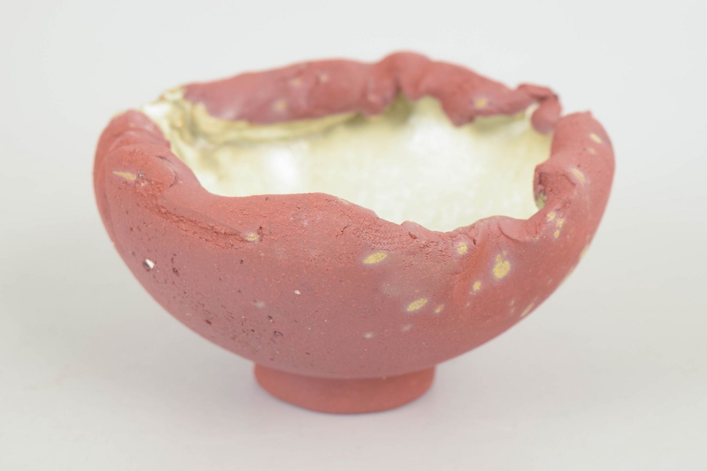 Christina Muff, Danish contemporary ceramicist (b. 1971).Small, one of a kind red stoneware bowl on foot. Unglazed on the outside the beautiful red clay contrasts the interior which is glazed in a creamwhite matte crystal glaze.