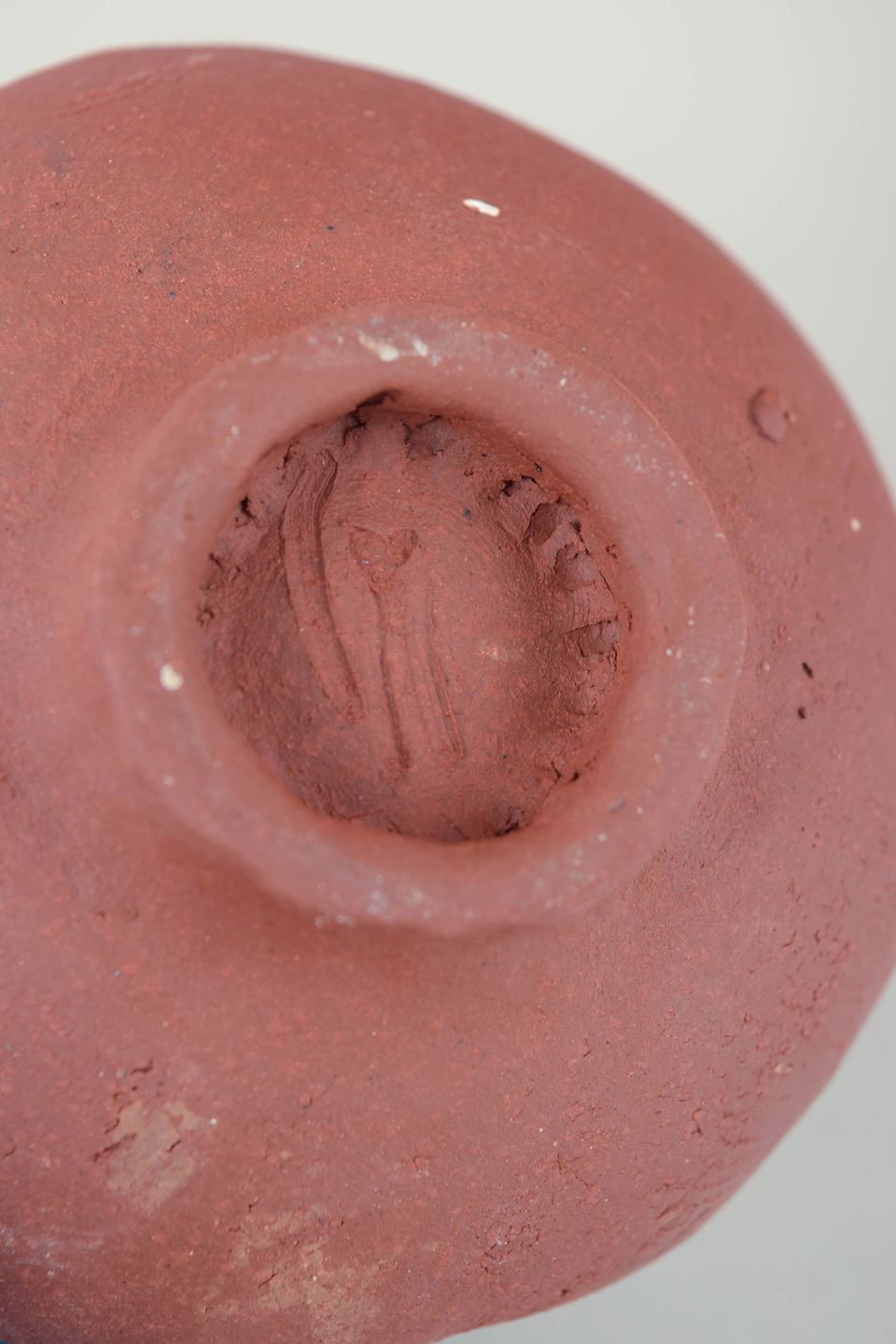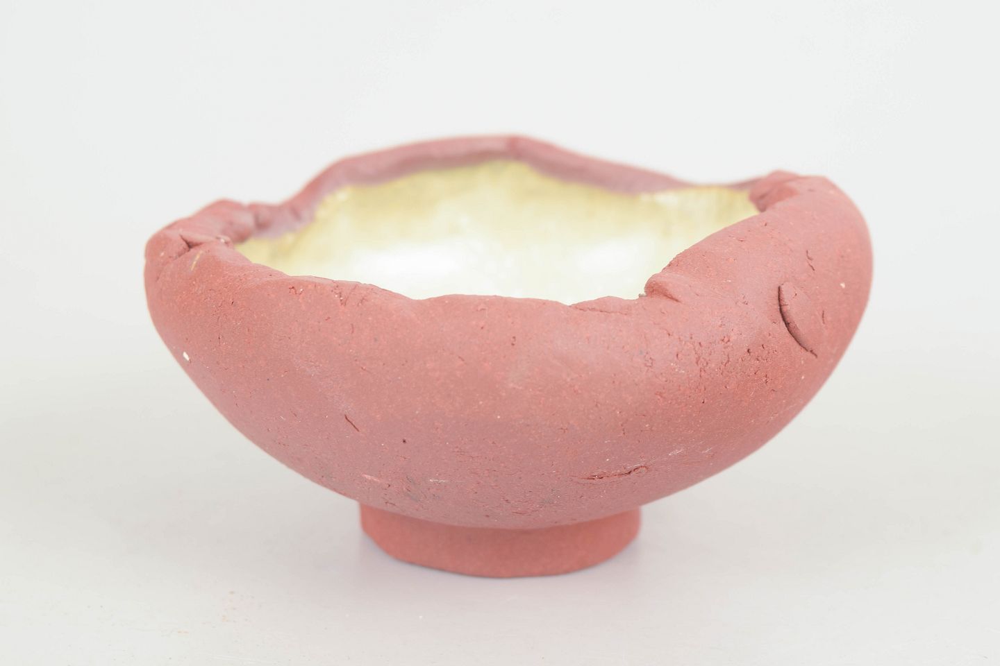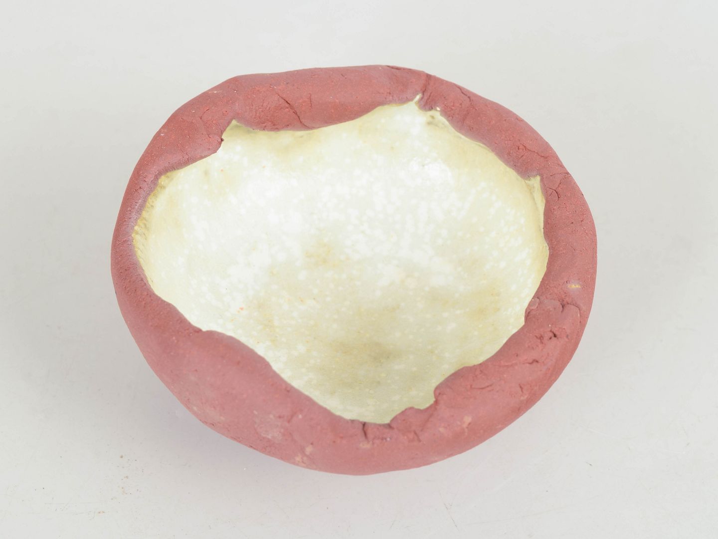 Christina Muff, Danish contemporary ceramicist (b. 1971).Tiny, one of a kind red stoneware bowl on foot. Unglazed on the outside the beautiful red clay contrasts the interior which is glazed in a creamwhite crystal glaze.
