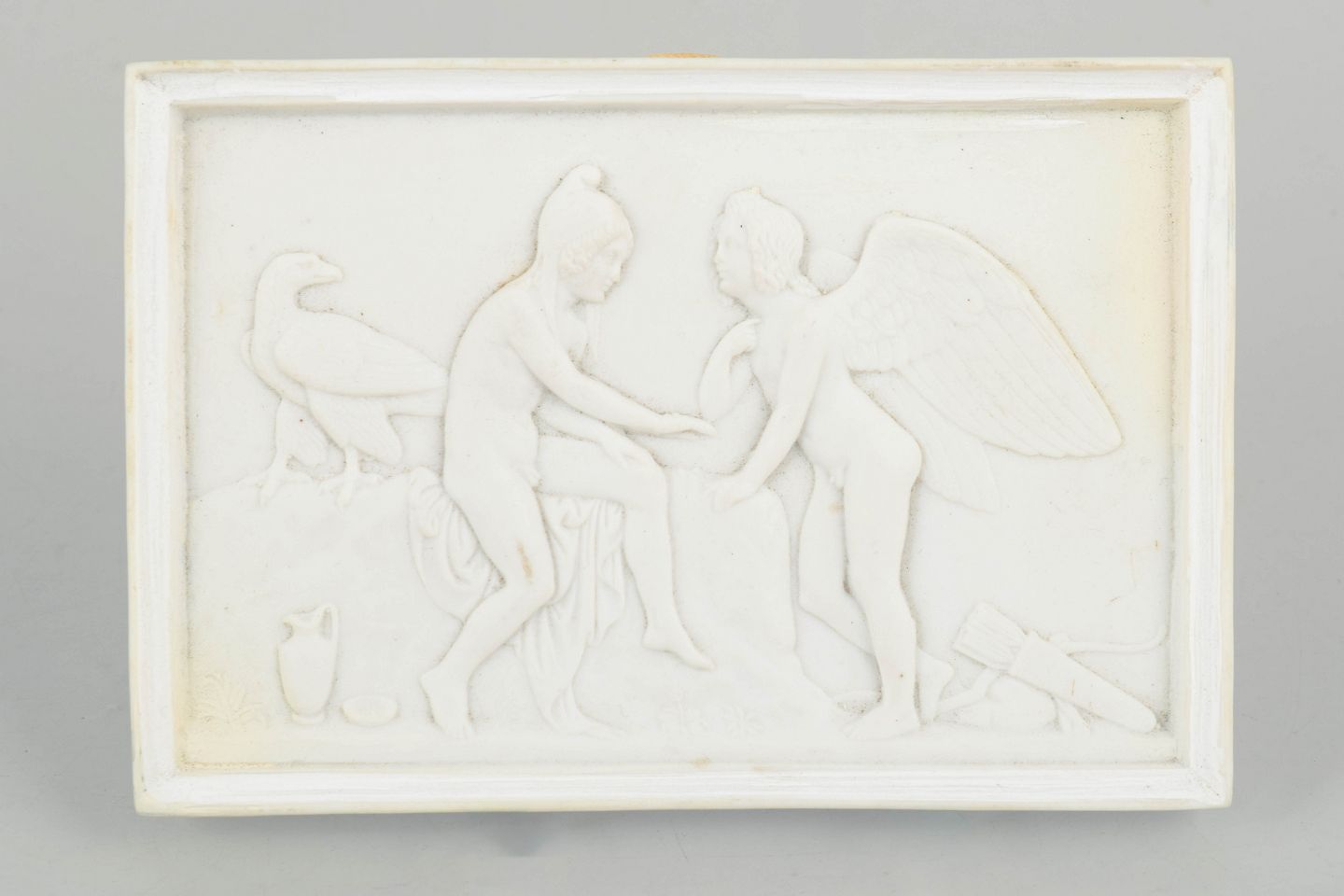Rectangular wall relief in white biscuit porcelain depicting a classical composition with putti after Bertel Thorvaldsen, executed with refined detailing and soft modelling in the neoclassical style.