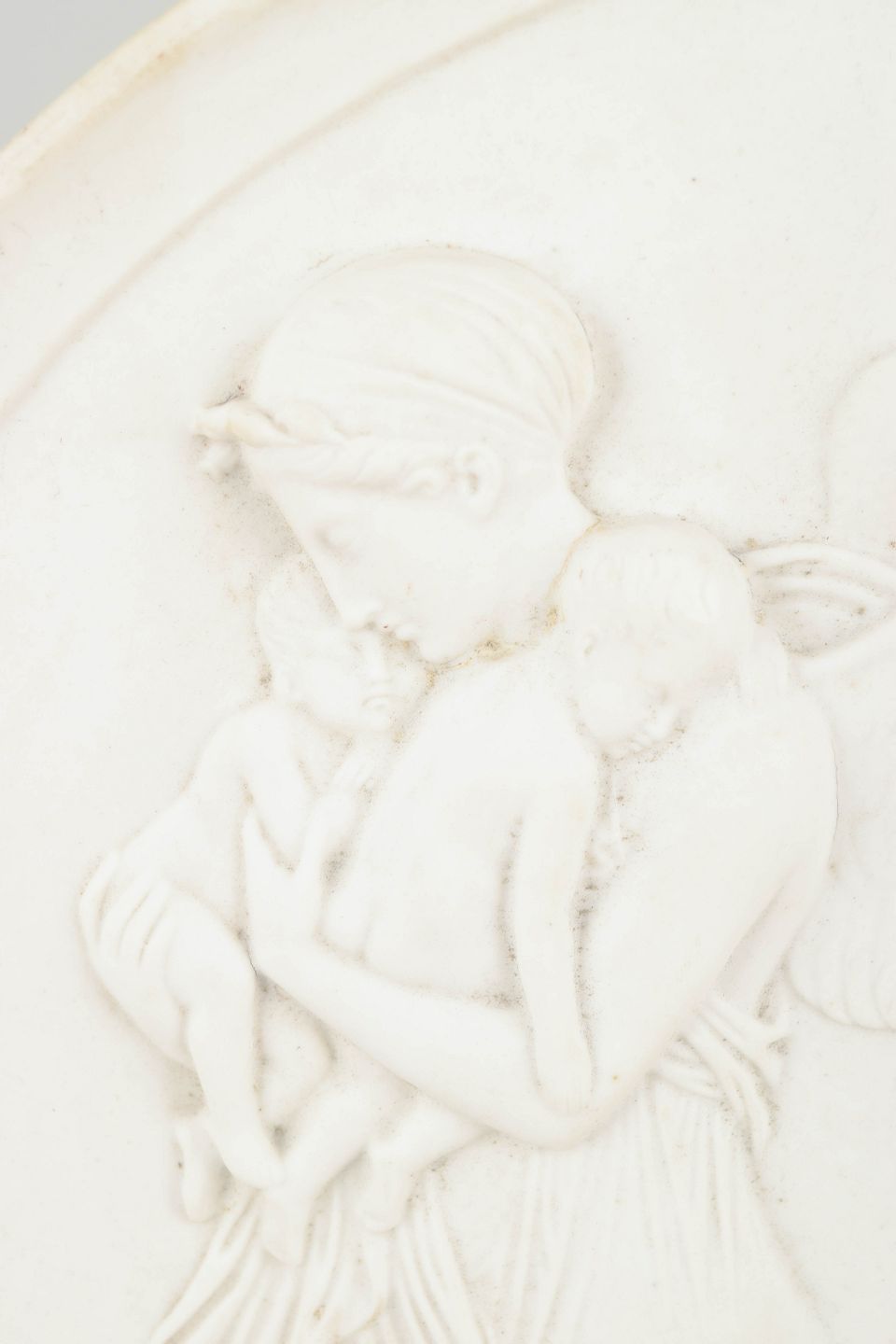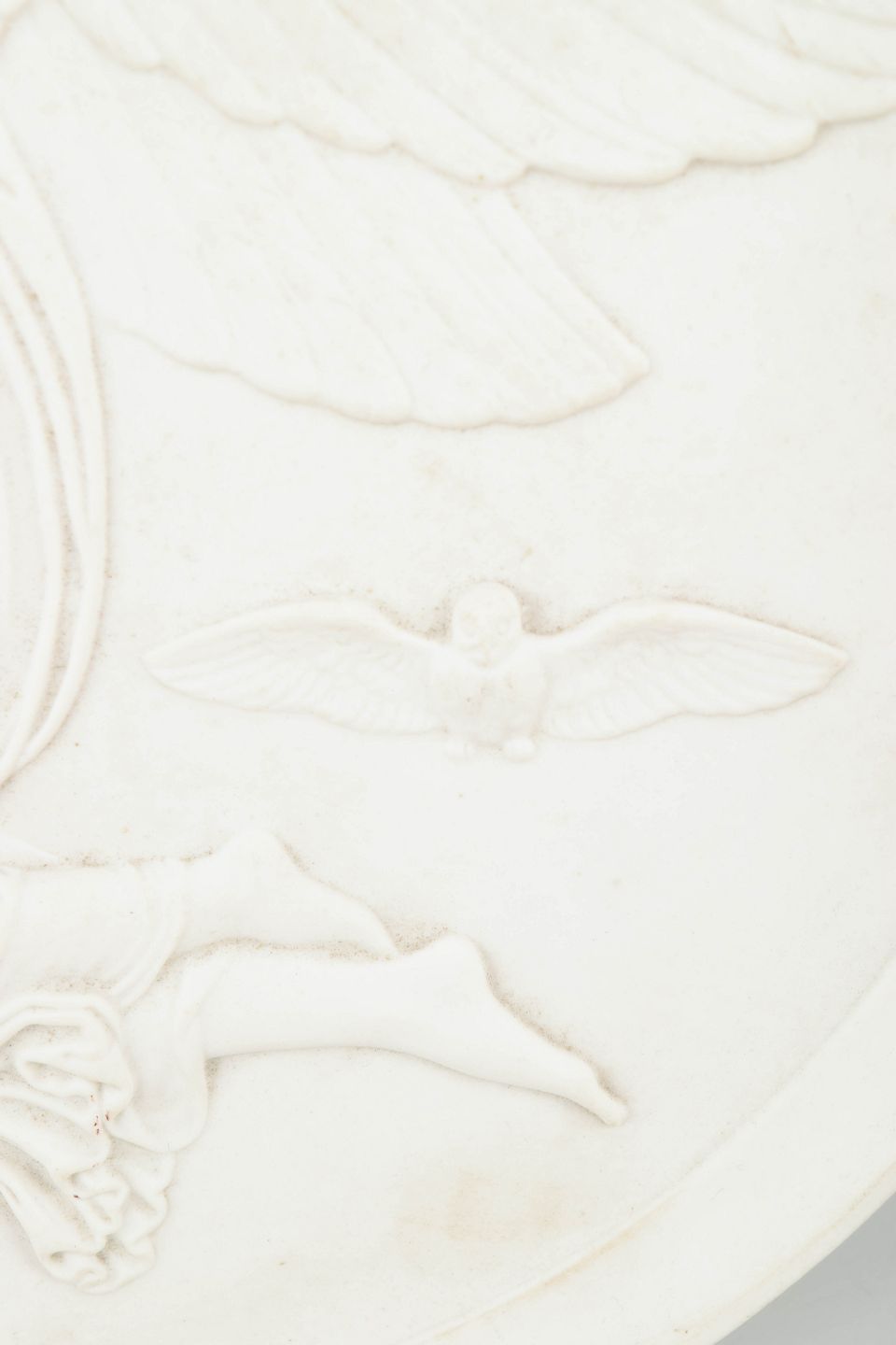 Royal Copenhagen biscuit relief after Thorvaldsen, wall plaque.Circular wall plaque in white biscuit porcelain with a relief depicting an angel motif after Bertel Thorvaldsen, executed with refined neoclassical detailing and soft modelling.