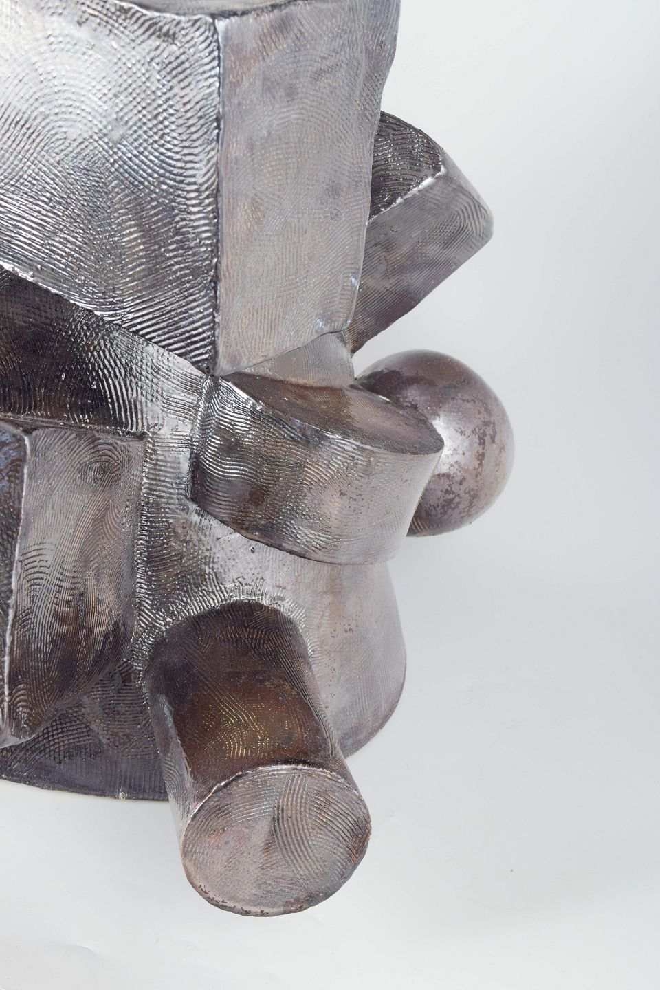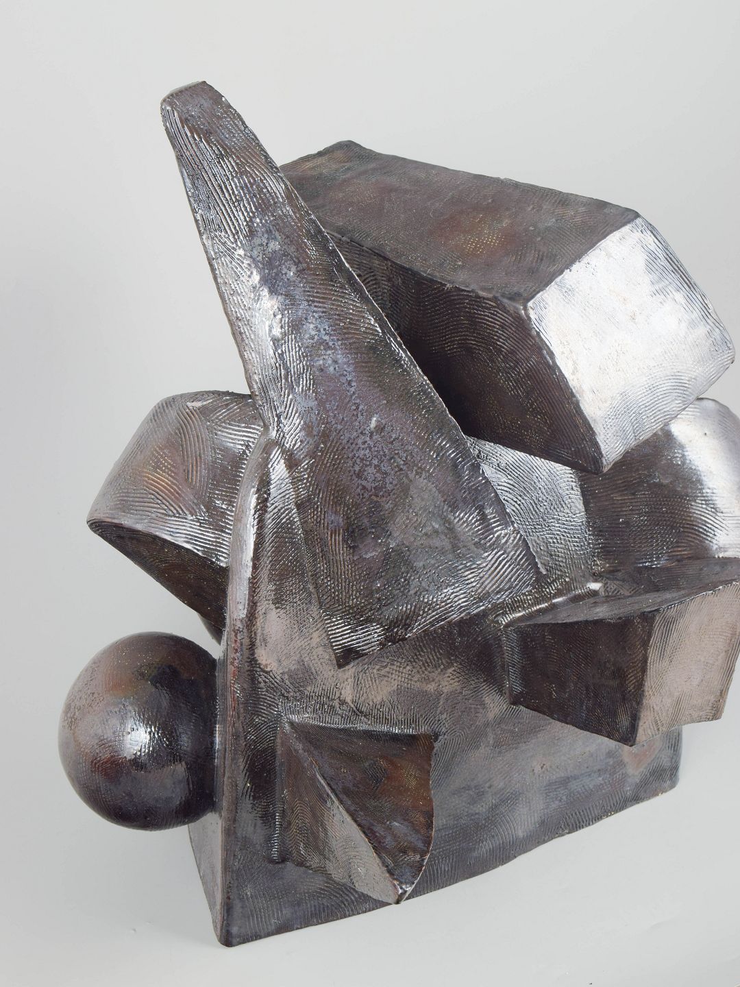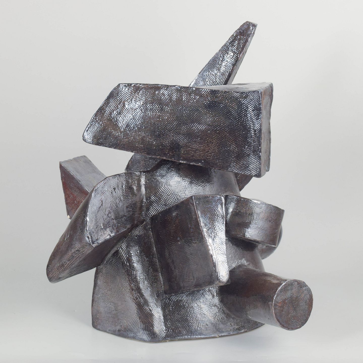 Christina Muff, Contemporary Danish ceramic artist (born 1971).Monumental sculpture, cubistic style. The stoneware surface is covered in a greyish black, almost metallic glaze.