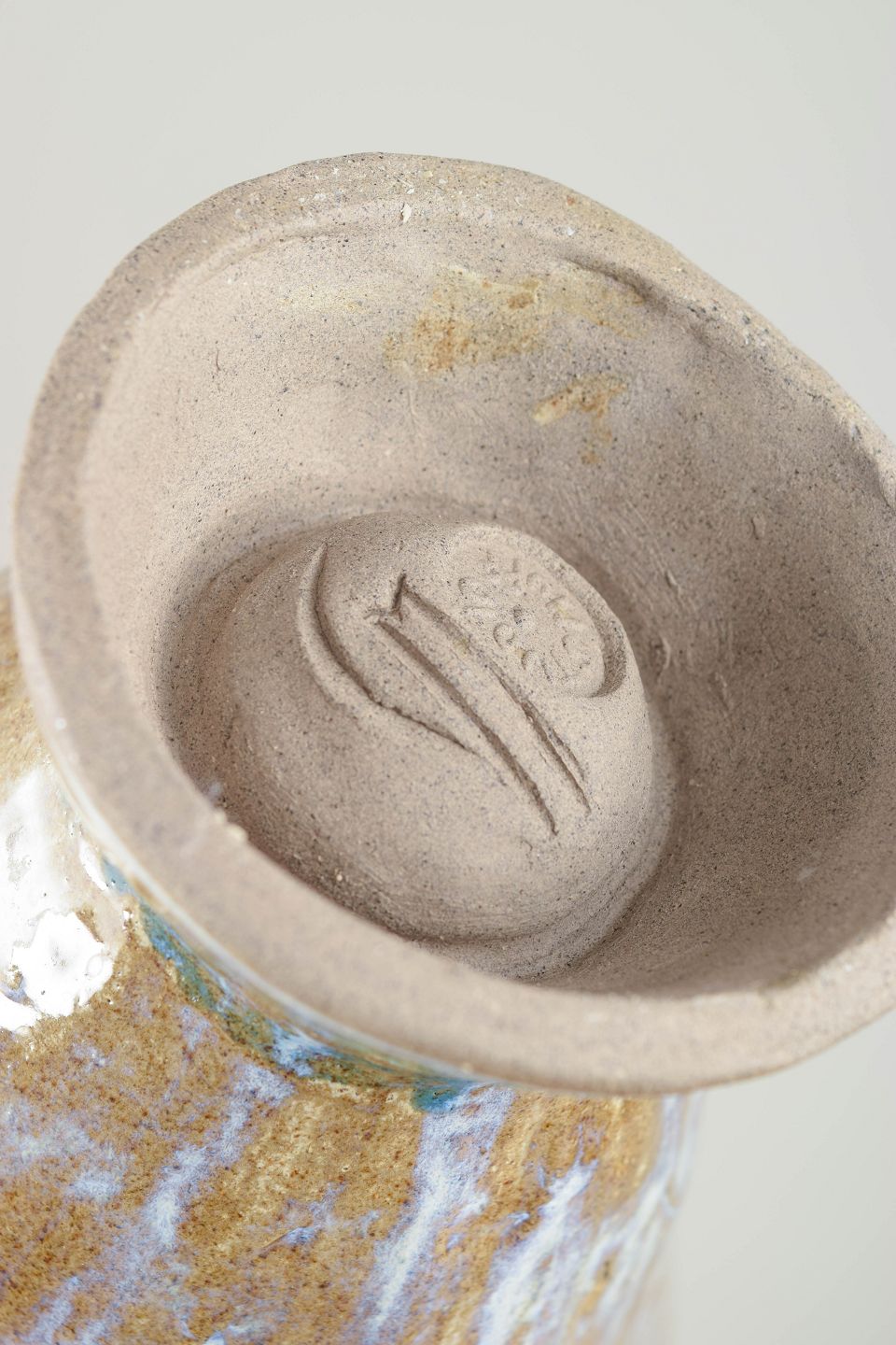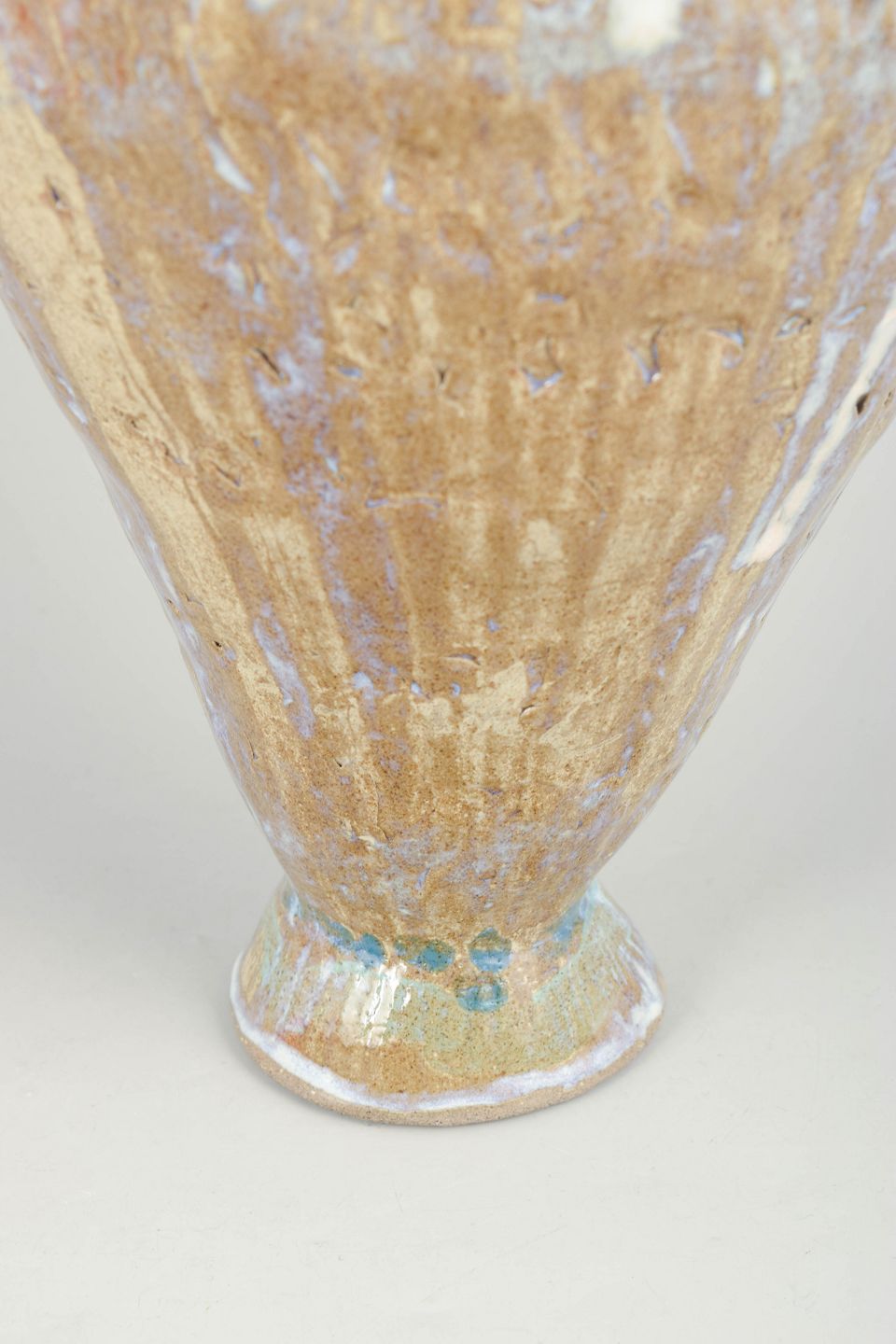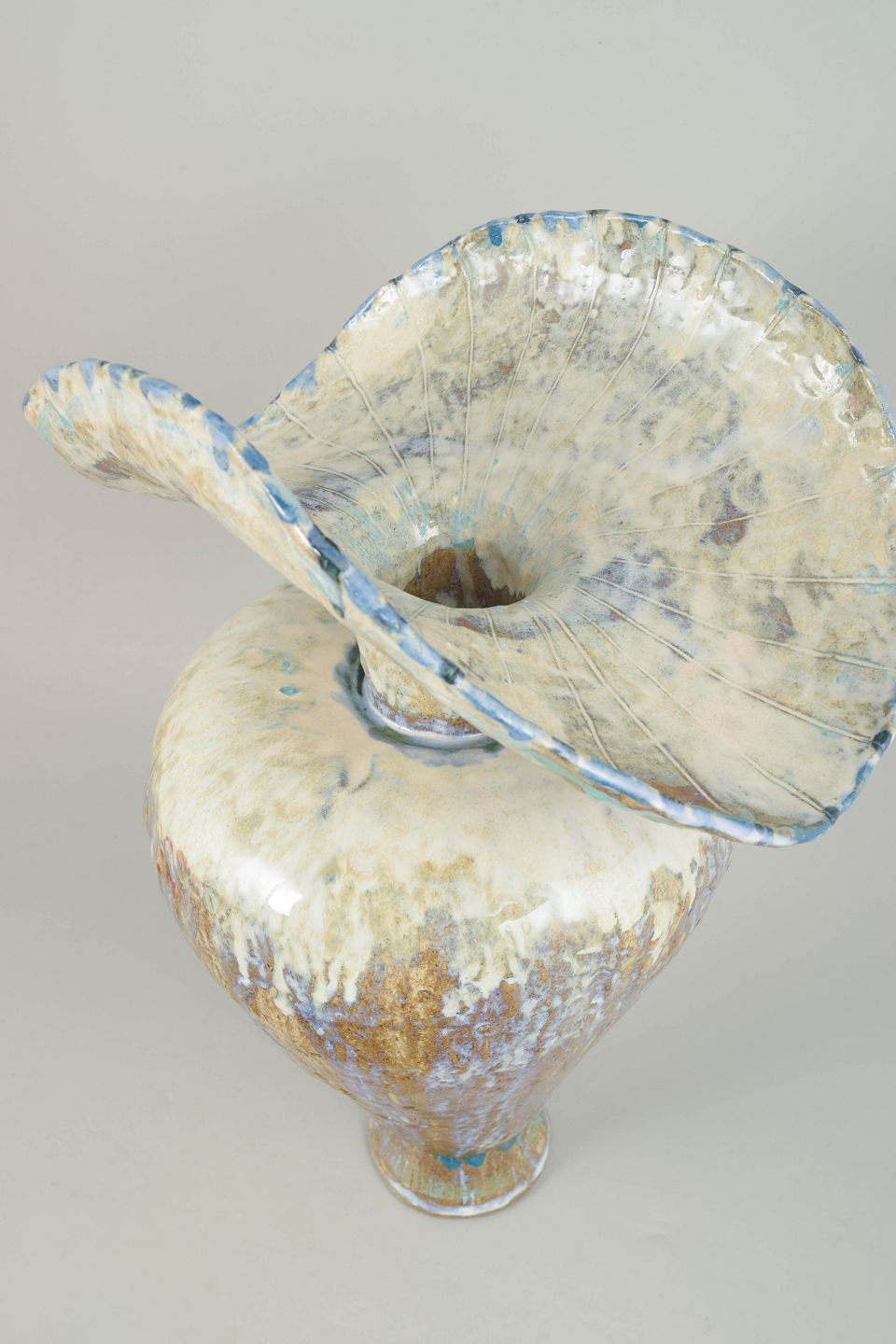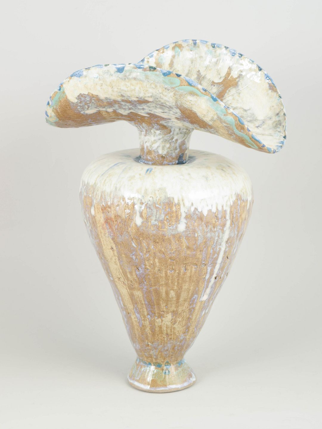 Christina Muff, Danish contemporary ceramicist (b. 1971).Very large hand modeled, organic shaped, vessel. The vessel is covered in cream and brown glaze with blue hues..