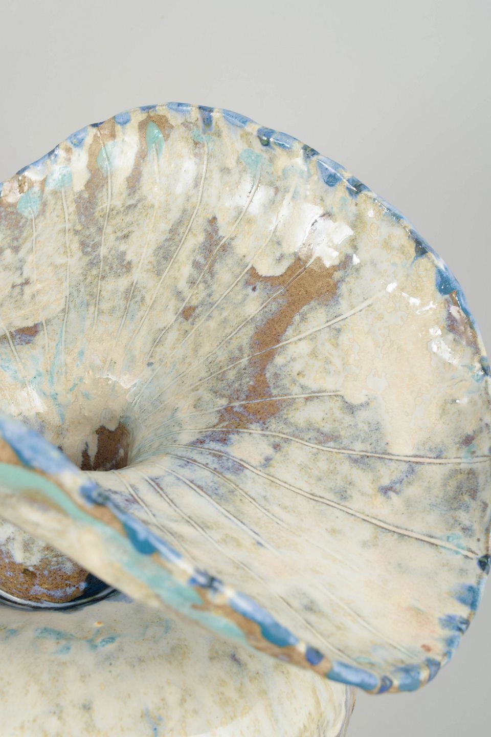 Christina Muff handcrafts her clay sculptures using techniques such as slab building and coiling. Large surfaces of clay are slowly shaped into detailed sculptures with complex, naturalistic forms. It is a time-consuming process, as the sculptures—due to their size—require a long drying period before being fired, often multiple times, to achieve the desired texture and color. During the glazing process, she uses a variety of techniques in combination with natural materials such as sand, chalk, and locally dug clay from Denmark. The goal is to create textures and surfaces that resemble man-made objects reclaimed by nature.