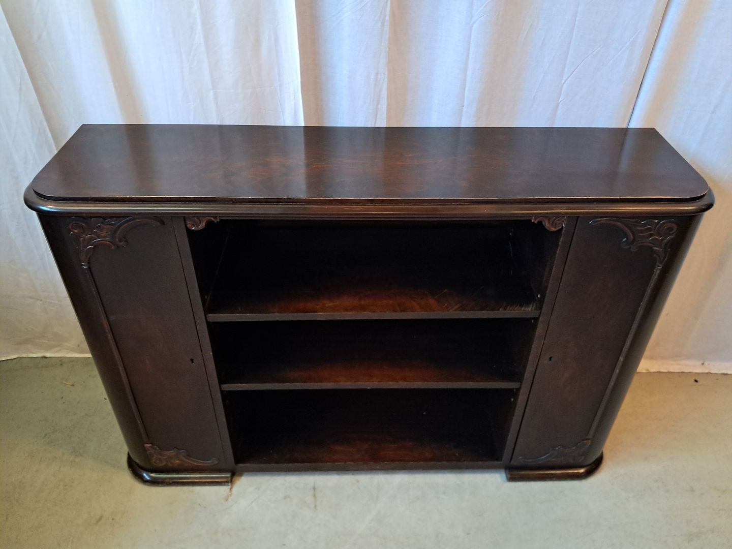 Reol i fineret birketræ, fra 1930erne.Den har en finer defekt og 2 defekter på prydlisterne. (se foto)
