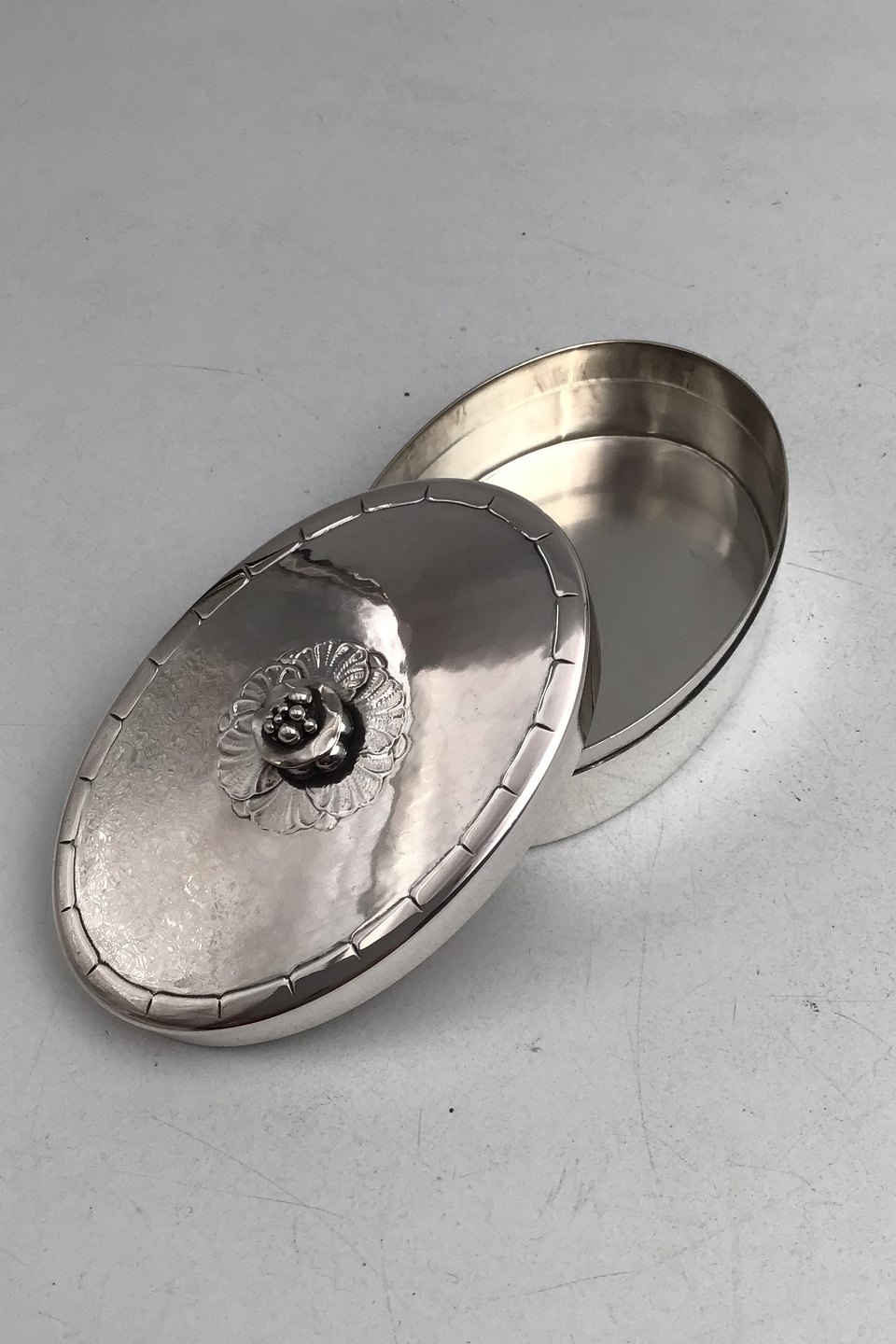 Georg Jensen Sterling Silver Pill Box No. 79 AB (1930-1945)Measures 9 cm x 6.2 cm (3.54 inch x 2.44 inch) H 3.8 cm (1.5 inch) Weight 90.42 gr (3.18 oz)
