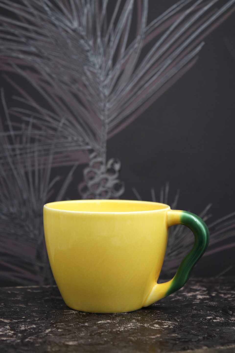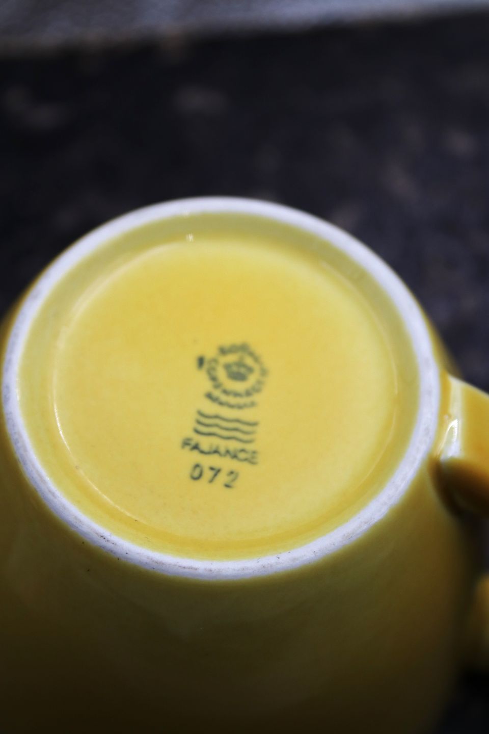 Ursula coffee cup in faience from Royal Copenhagen designed by Ursula Munch-Petersen, coffee cup in yellow glaze with green handle
