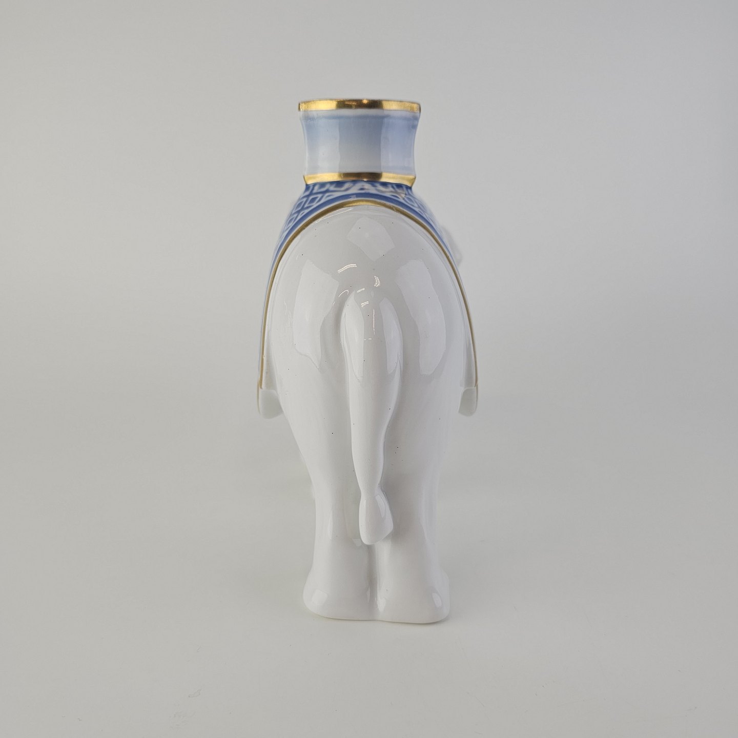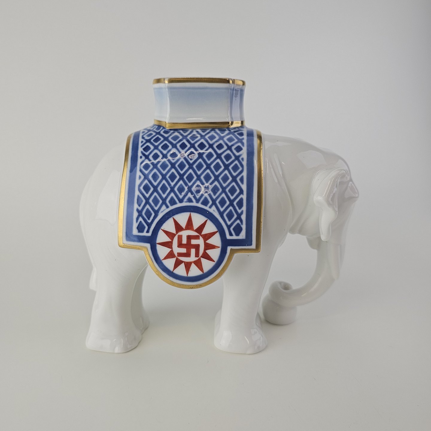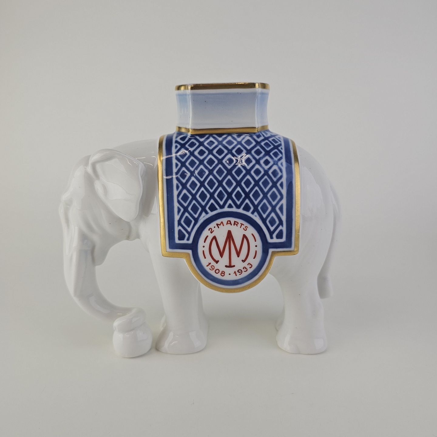 Figur i hvidt porcelæn med motiv af en elefant med teksten 2. marts 1908-1933 på den ene side. Lavet specielt til Carlsberg, brugt som gave derfra.Producent Bing og Grøndahl