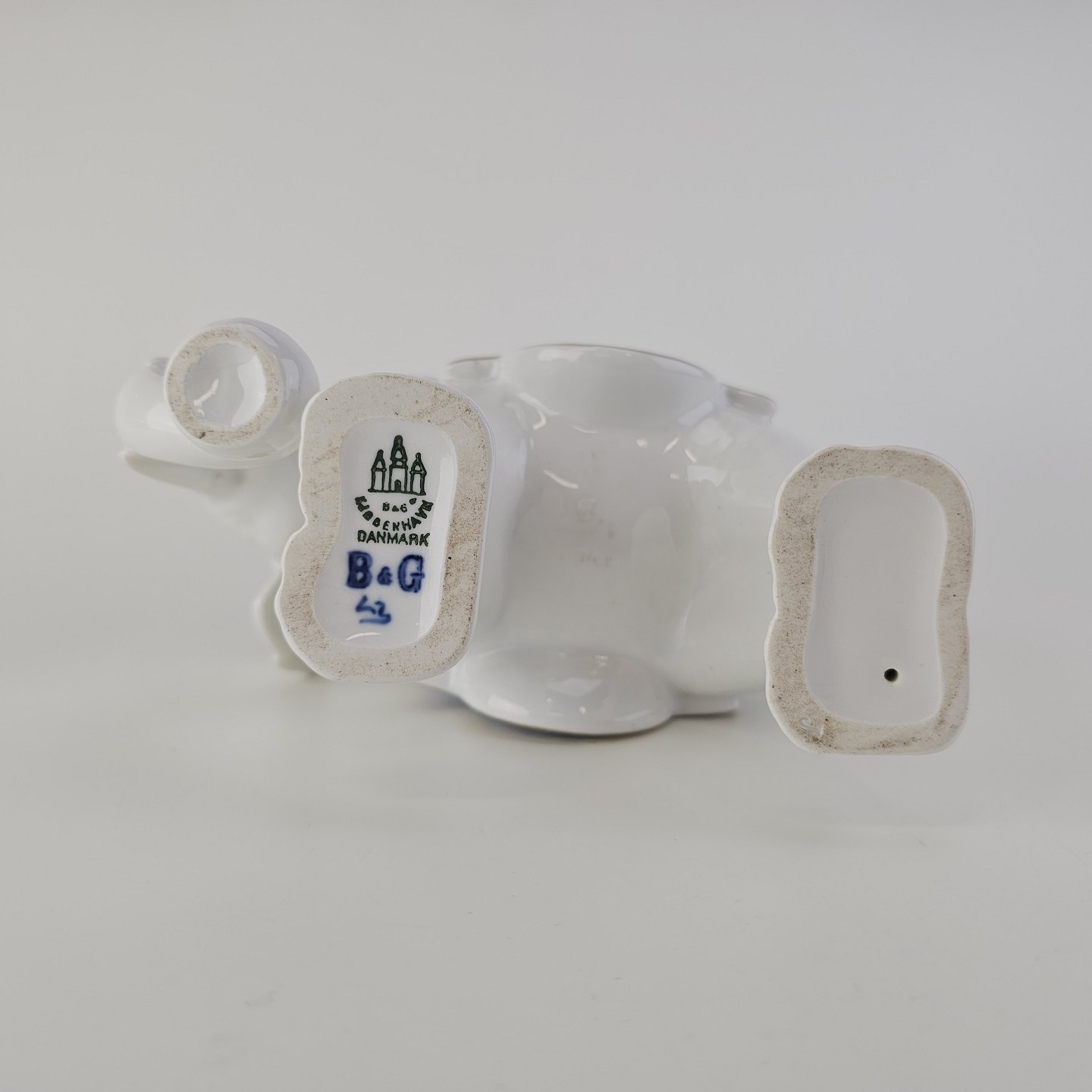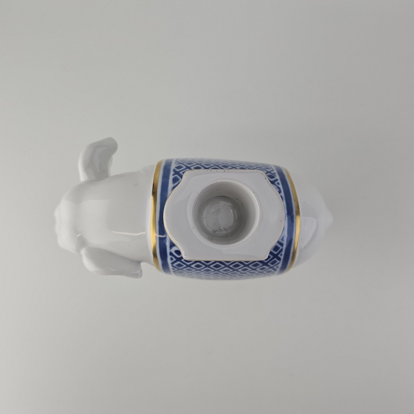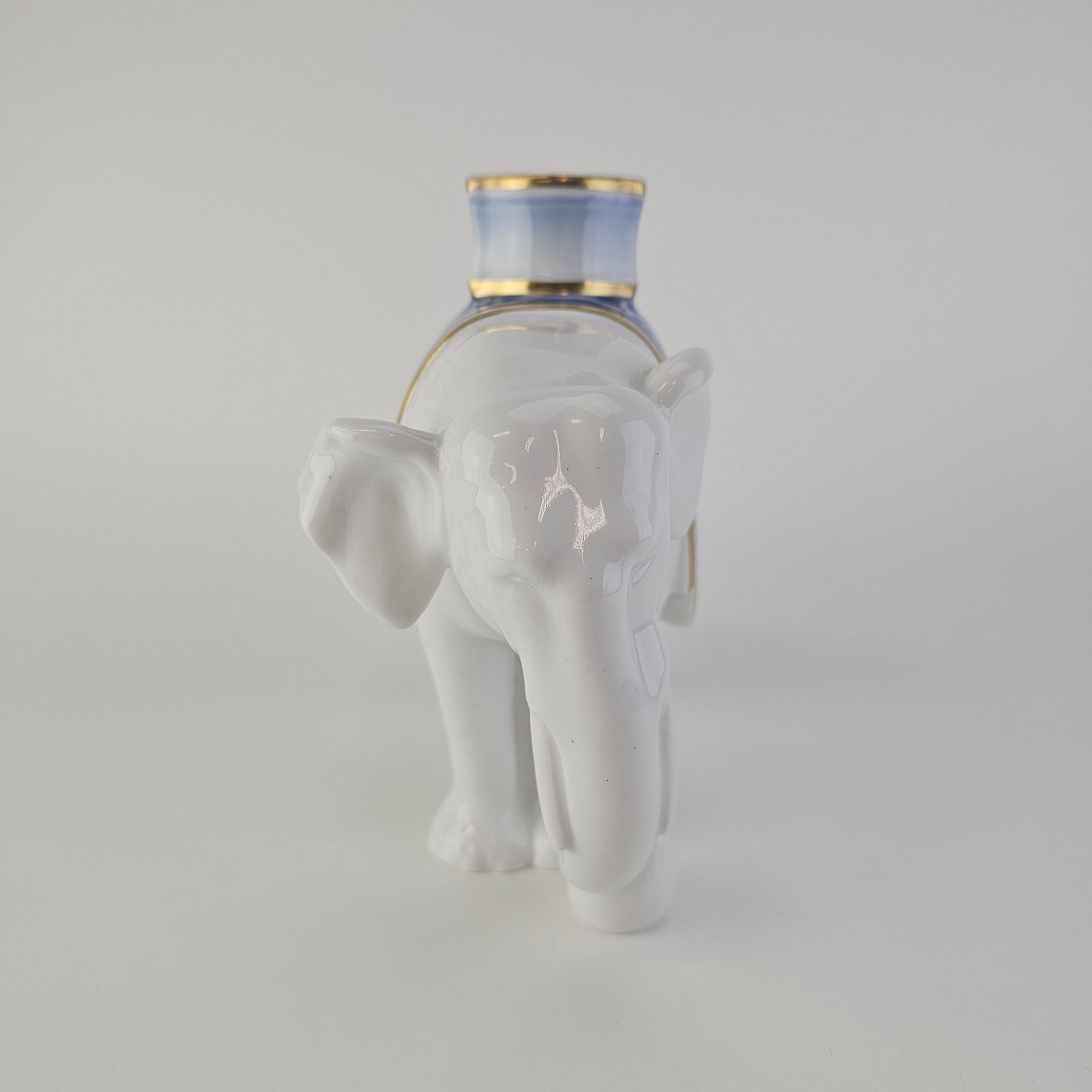 Figur i hvidt porcelæn med motiv af en elefant med teksten 2. marts 1908-1933 på den ene side. Lavet specielt til Carlsberg, brugt som gave derfra.Producent Bing og Grøndahl
