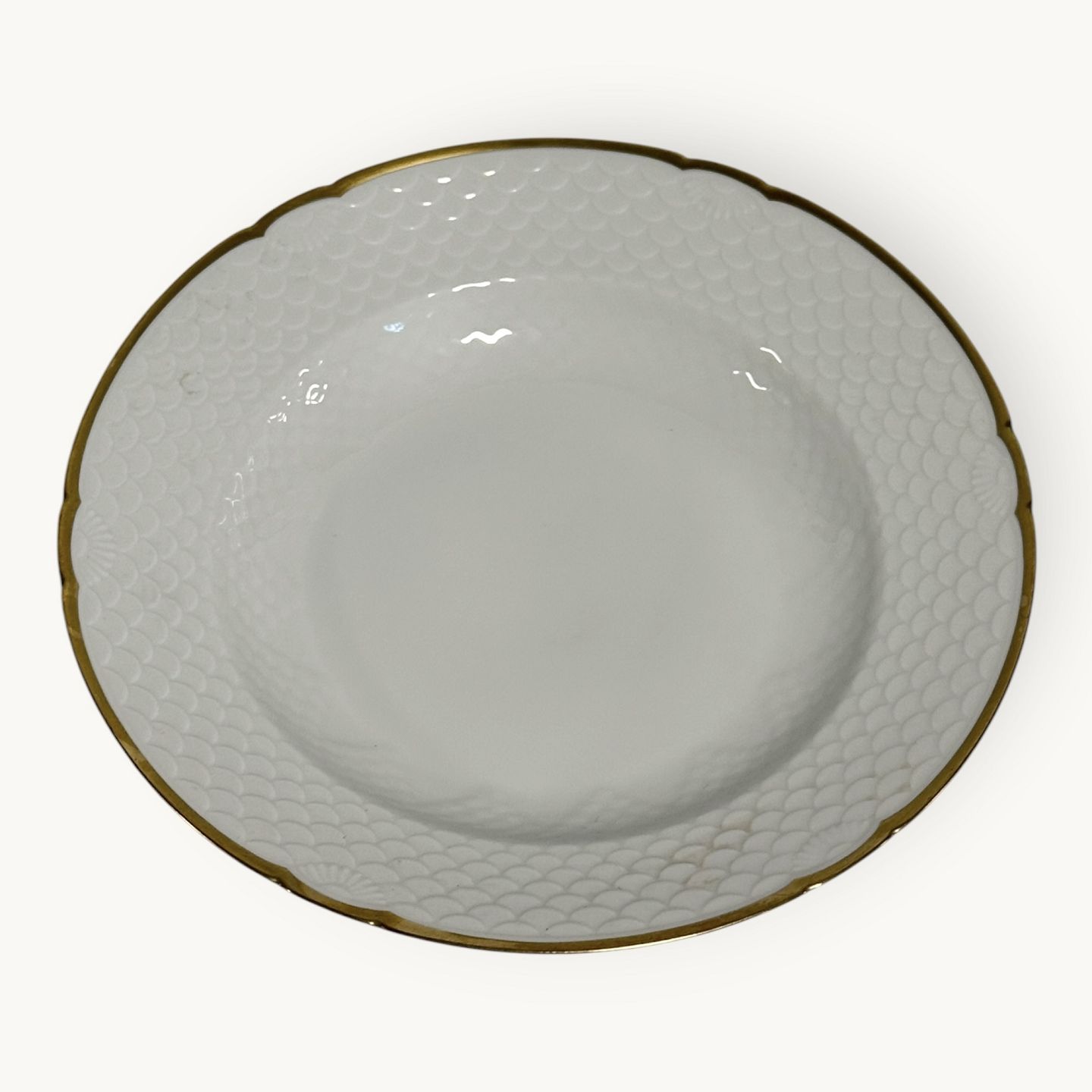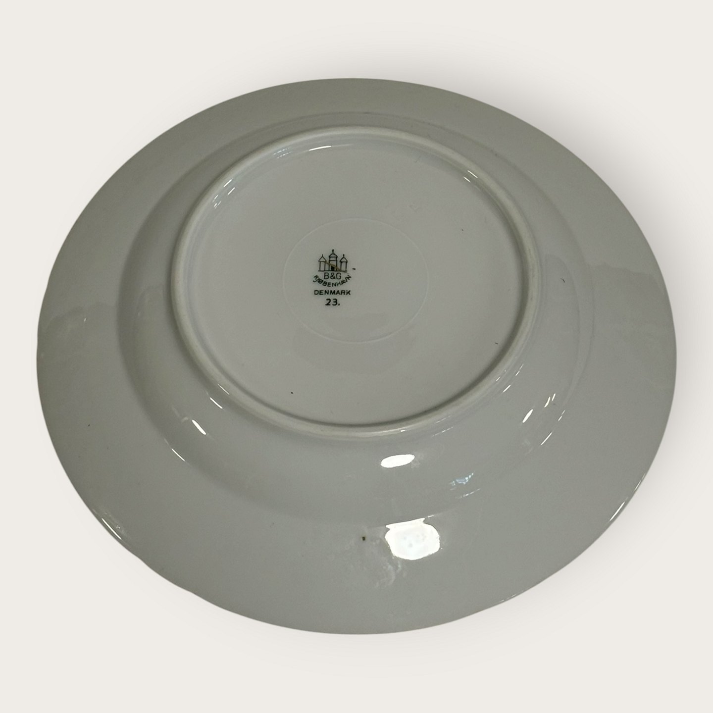 Bing & Grondahl, Aakjær, White porcelain with a gold rim, deep plate # 23, 21.5cm in diameter, 1st grade *Good condition*Stock: 11